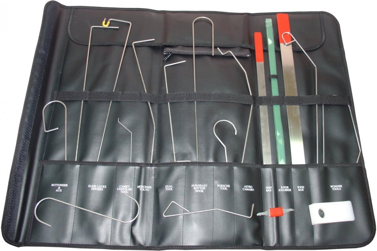 Набор приспособлений для открывания дверей Станкоимпорт KA-6633 станет надежным помощником для разблокировки центрального замка при его случайном срабатывании или при потере ключей. В данном комплекте представлены все необходимые приспособления для работы с автомобилями различных марок и моделей. Изделия способствуют легкой разблокировке дверей механическим способом, при этом не повреждая декоративные молдинги и резиновые уплотнители. Наличие специальной отмычки позволяет вскрыть даже крышку бензобака. Для удобства хранения и транспортировки набора предусмотрен специальный чехол, на карманах которого дополнительно указаны марки автомобилей.