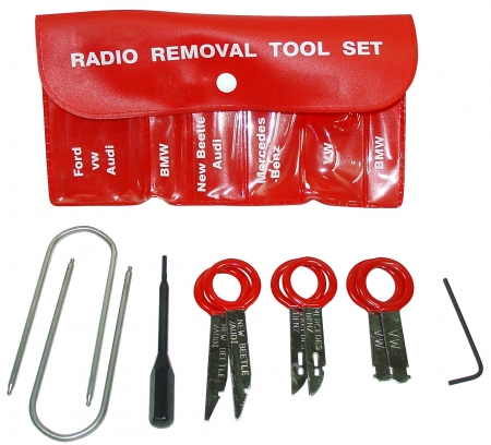 Набор приспособлений для демонтажа магнитол 10 предметов. Набор включает в себя комплект ключей для штатных мультимедия устройств. Для удобства использования проушину ключей имеют полиуретановую обливку. Все инструменты в наборе изготовлены из качественной стали. Комплектация: 2 ключа для модуля навигации и CD-changer'а VW-Audi Concert, Symphony I и Symphony II (оригинальный номер T10057); 2 ключа для VW Passat, Jetta, Golf (оригинальный номер 3316); 1 ключ пятигранный для BMW; 1 ключ для BMW; 2 ключа для Mercedes-Benz (W129, W140, W163, W202, W210),