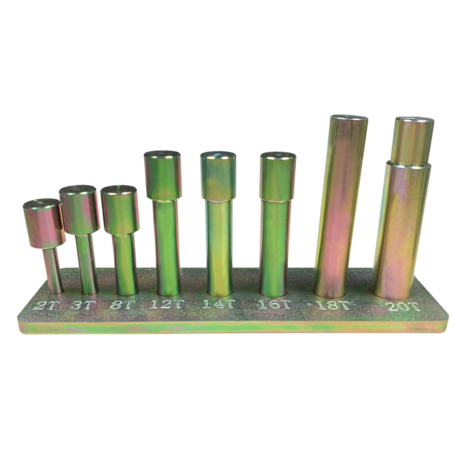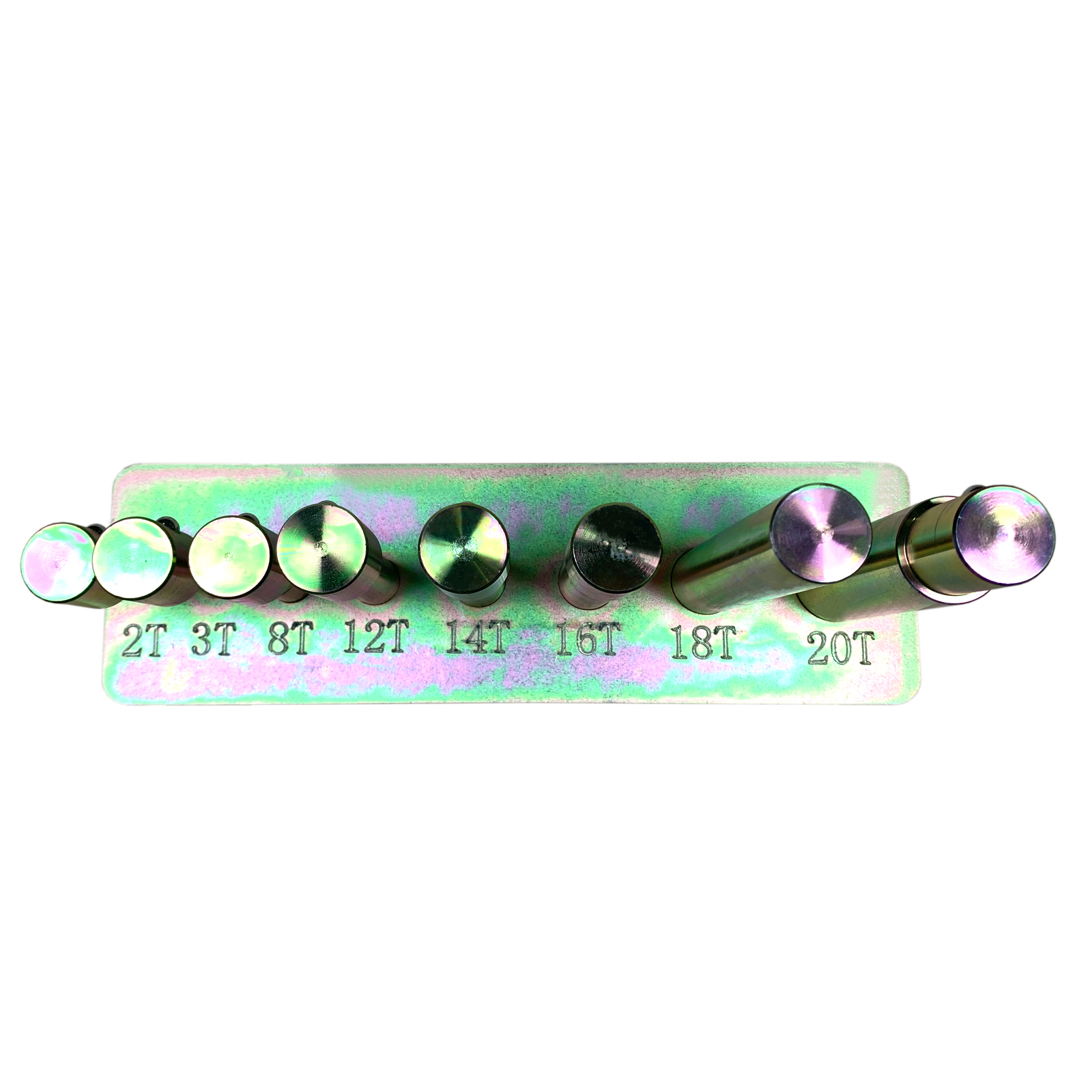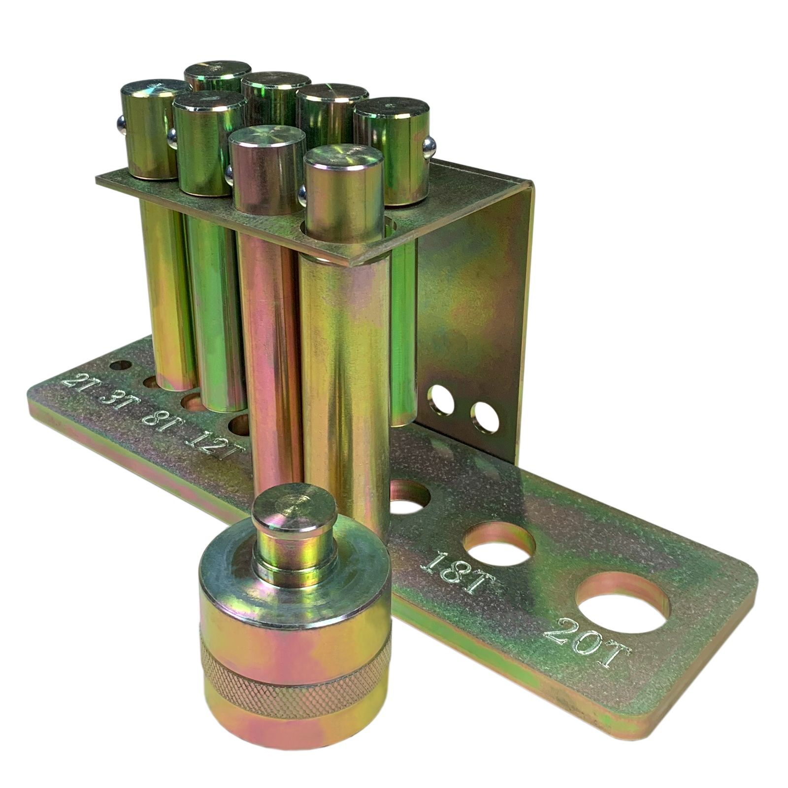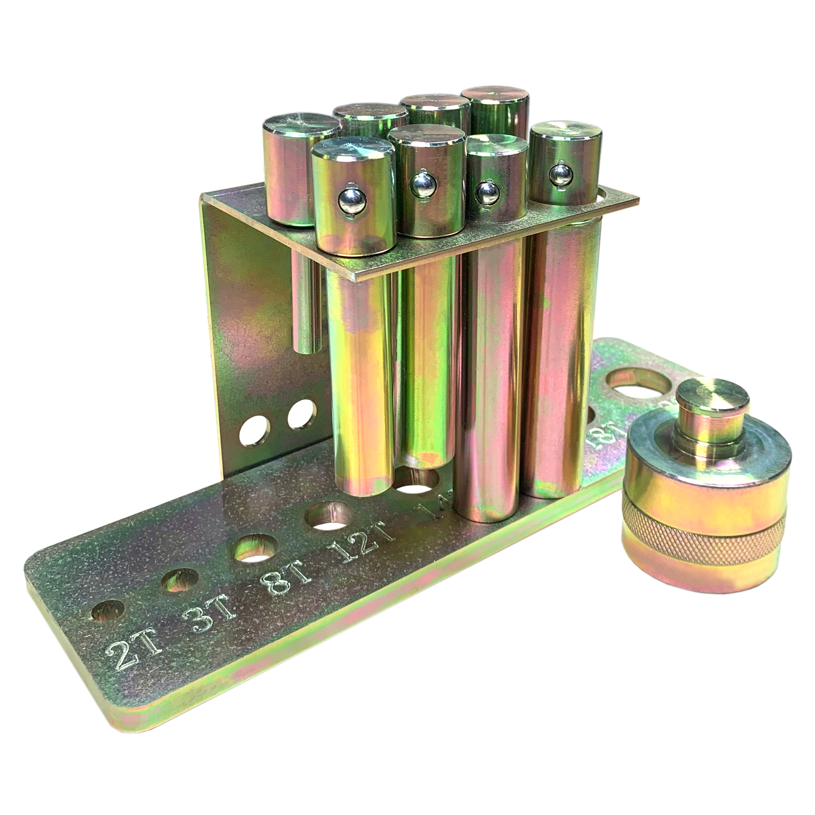 Набор из восьми пуансонов и пресс-формы для гидравлического пресса. С держателем для крепления к прессу. Подходит для использования с прессами моделей T61204M, T61210M, T61212M, T61212M, T61220M, T61220M.
