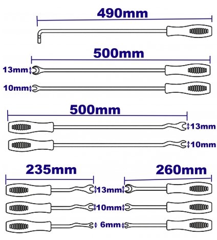 Назначение: Применяется для снятия кузовных пистонов различных размеров и конфигураций. Особенности: Съемники изготовлены из высококачественной инструментально стали, ручки изготовлены из полимера стойкого к агрессивным средам. Набор включает в себя съемники различной конфигурации и длины что позволяет перекрыть практически все потребности арматурщика. Состав: Съемник прямой: 6х260 – 1шт. 10х260 – 1шт. 13х260 – 1 шт. Съемник изогнутый: 6х235 – 1шт. 10х235 – 1шт. 13х235 – 1шт. Съемник прямой: 10х500 – 1шт. 13х500 – 1 шт. Съемник изогнутый: 10х500 – 1шт. 13х500 – 1 шт. Поддержка – 1 шт. Инструмент компании СТАНКОИМПОРТ соответствует требованиям стандартов качества ГОСТ и DIN, а по некоторым параметрам их превосходит.