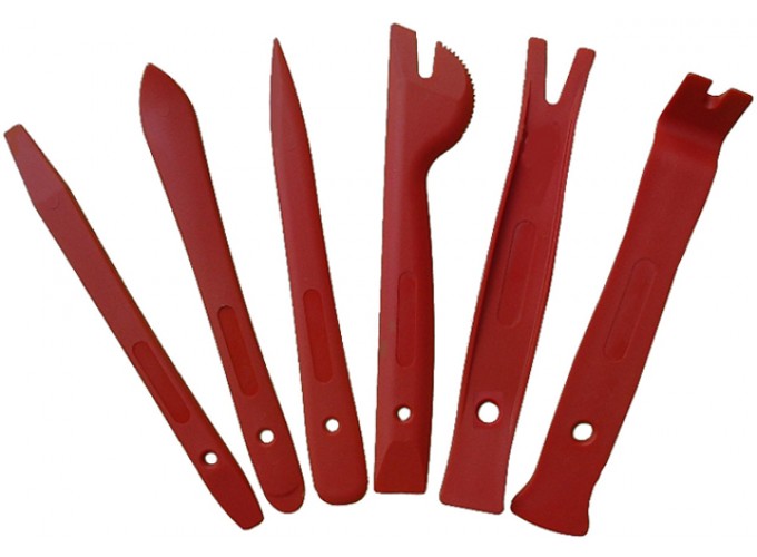KA-2441-6 Набор съемников пластиковых и деревянных элементов, 6 пр. Предназначен для демонтажа обшивок салона автомобиля и декоративных элементов. Особенности: Изготовлены из прочного пластика. Исключают вероятность повреждения пластиковых и деревянных элементов при их демонтаже. Используются при демонтаже приборных панелей, облицовок селектора КПП, вентиляционных отверстий климатических установок, обшивок дверей, молдингов и т.д. Наличие лопаток с различными профилями делает набор универсальным. Комплект набора: Съёмники - 6 шт. Блистерная упаковка - 1 шт.