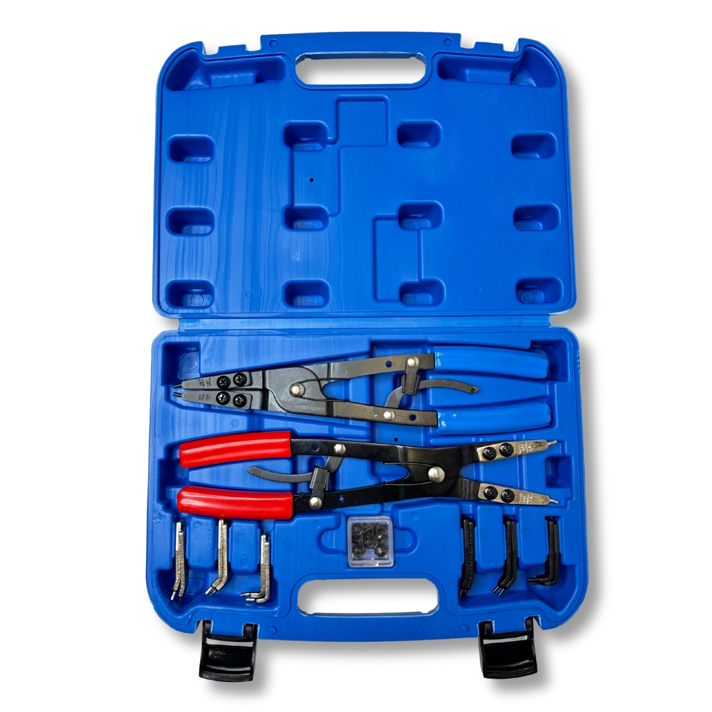 Клещи для стопорных колец для наружных стопорных колец, самостопорящиеся. Отверстие: 7-42 мм -клещи для внутренних стопорных колец, самостопорящиеся Отверстие: 7-44 мм - Сменные наконечники для внутреннего и Наружные стопорные кольца следующих размеров: Ø 2,75 мм, по одной паре 0°-15°-45°-90° под углом Ø 3 мм, каждая пара под углом 0°-15°-45°-90°