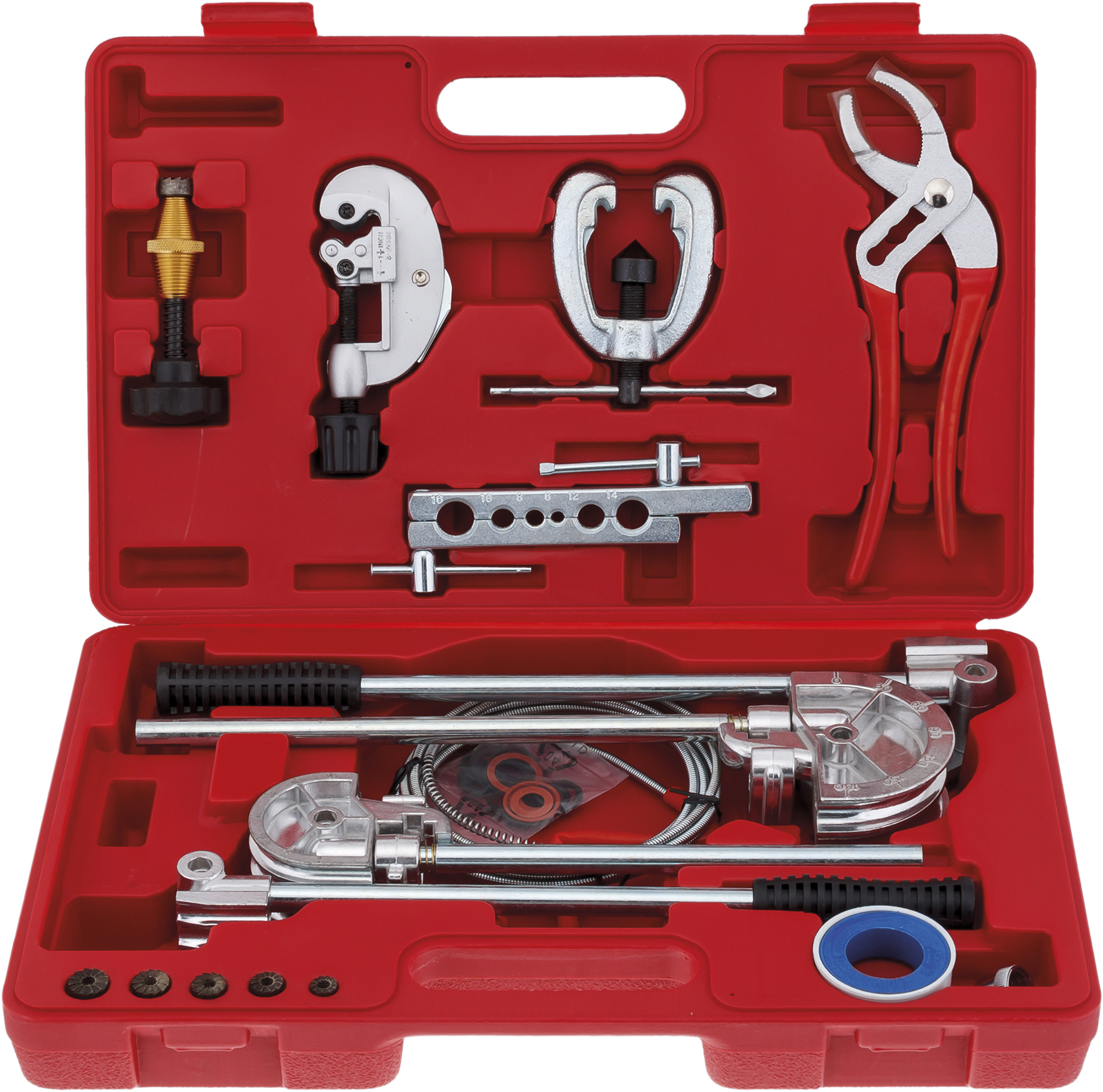 KA-6521 Набор предназначен для загибания и обрезки металлических труб. Набор для развальцовки и резки медных трубок Ø: 6, 8, 10, 12, 14, 16 мм Инструмент для резки труб: 3-28 мм Набор для гибки труб: 4 размера Ключ переставной Инструмент для чистки труб гибкий Инструмент для работы с трубами Лента Набор уплотнительных колец
