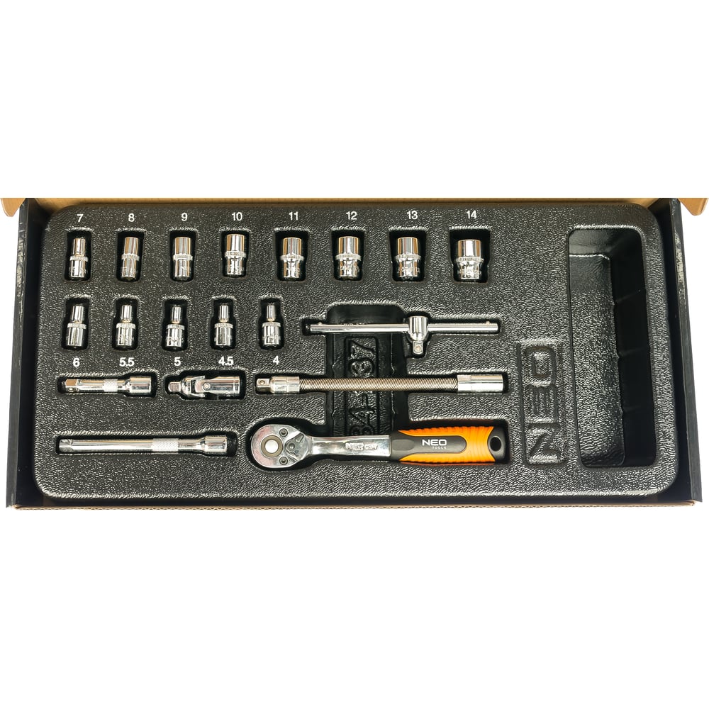 Набор сменных головок 1/4, 19 шт. NEO 84-237 поставляется в специальном ложементе, который отлично размещается в инструментальных ящиках. Все комплектующие набора изготовлены из хромованадиевой стали, что является гарантией долговечности.