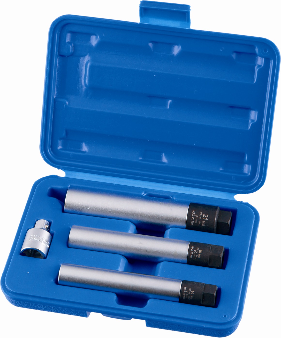 KA-5175B Набор 12-ти гранных свечных головок 14, 16, 21 мм с ограничением крутящего момента. Используется для закручивания свечей зажигания. Исключают вероятность превышения усилия. Возможно использовать в качестве привода вороток или трещотку на 1/2"; на 3/8", а так же гаечный ключ или торцевую головку. Резиновые вставки для фиксации свечей. Наименование Адаптер уменьшающий 1/2" - 3/8" Головка 12-ти гр. 21 мм, длина 140 мм, усилие 25 Nm, Головка 12-ти гр. 16 мм, длина 125 мм, усилие 20 Nm, Головка 12-ти гр. 14 мм, длина 125 мм, усилие 19 Nm,