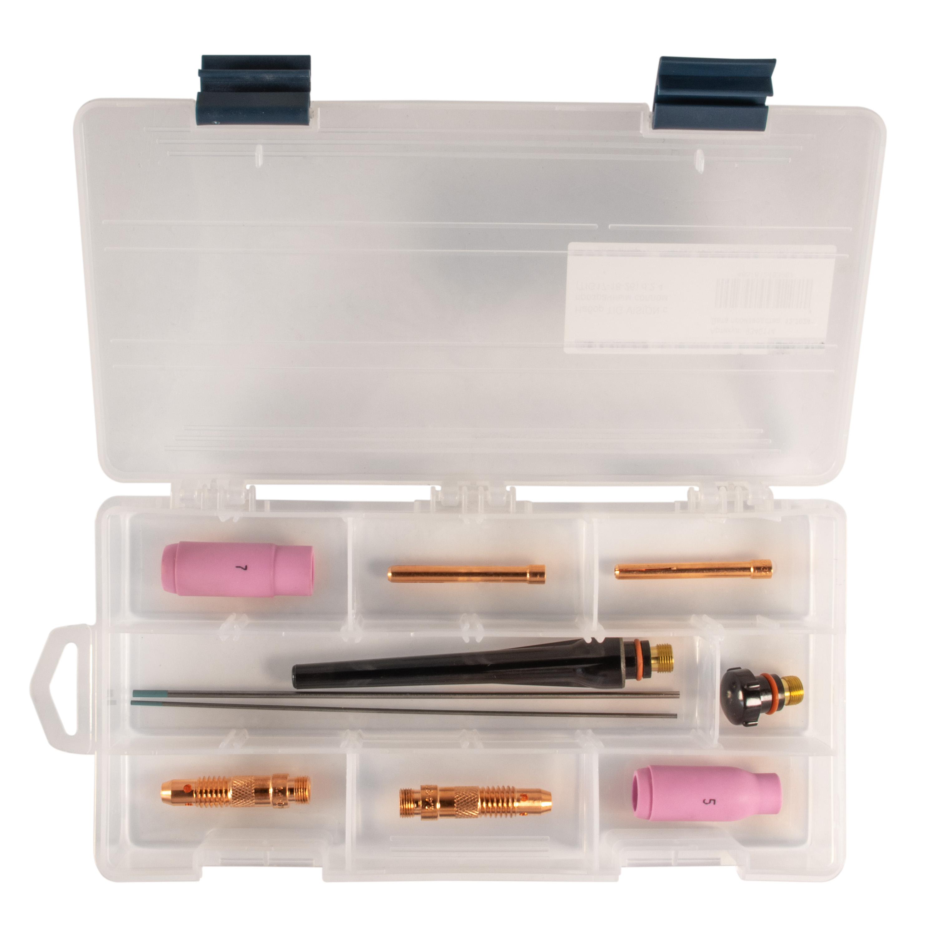 Полный набор расходных материалов для работы с горелками TIG17-18-26. Оснастка для аргонодуговой сварки, обычно не включена в штатную комплектацию горелок. Набор закрывает все потребности сварщика для начала работы с TIG сваркой.