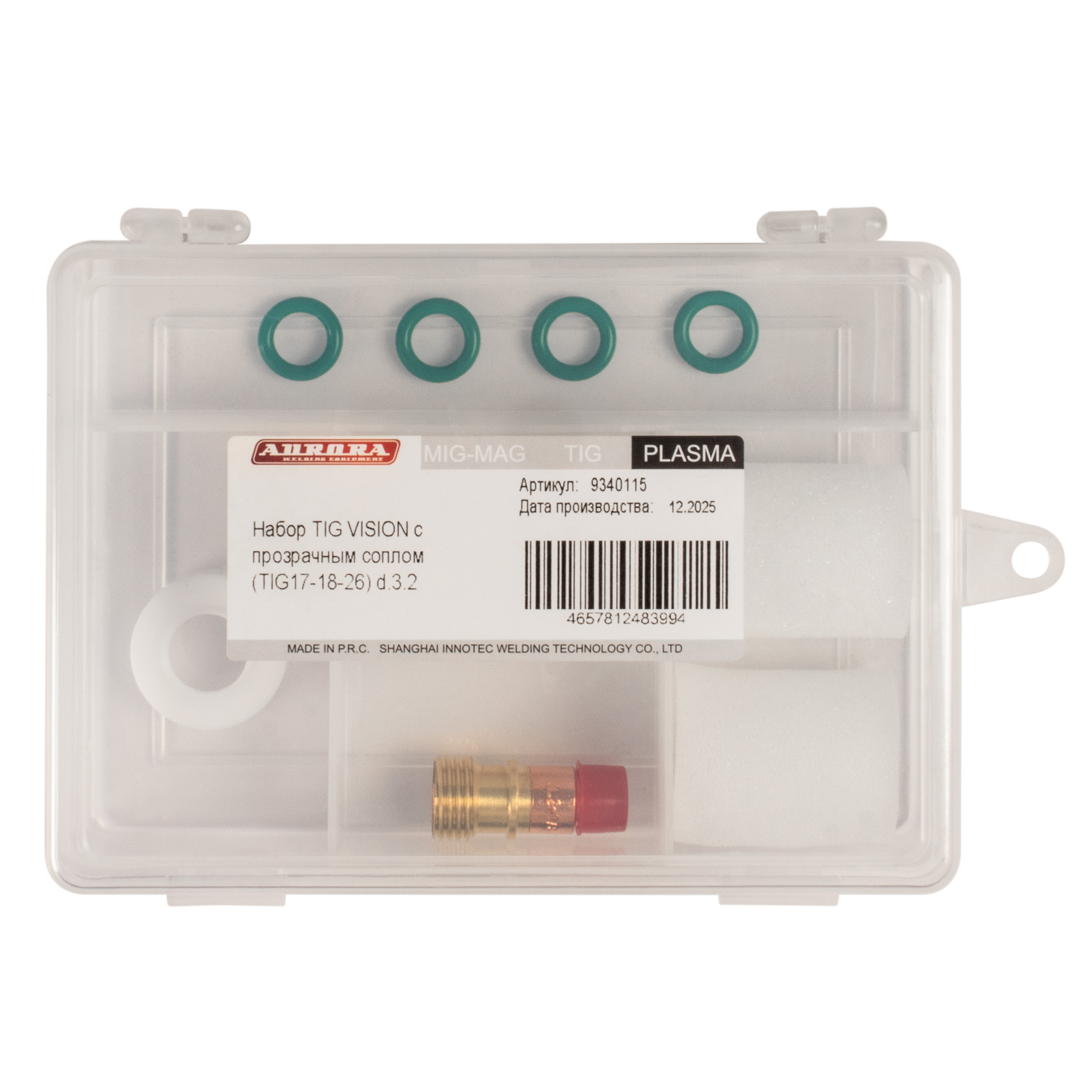 В кейсе два прозрачных сопла из закалённого кварцевого стекла, которые не ограничивают обзор в процессе сварки. Цанга и цангодержатель с газовой линзой для электрода 3.2мм. Изолятор и уплотнительное кольцо для установки на горелку.