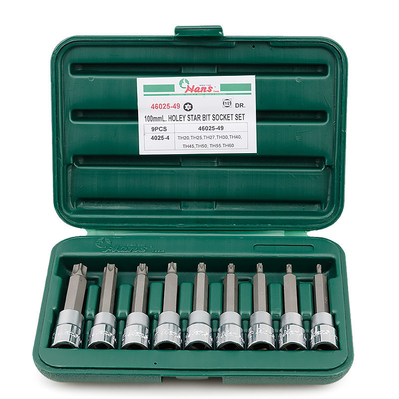 46025-49 набор головок TORX с отвер. L=100мм на 1/2" 9 пр. в кейсе 4025-4 торцевая головка 1/2'' со вставкой TORX HOLEY TH20, TH25, TH27, TH30, TH40, TH45, TH50, TH55, TH60 L=100мм
