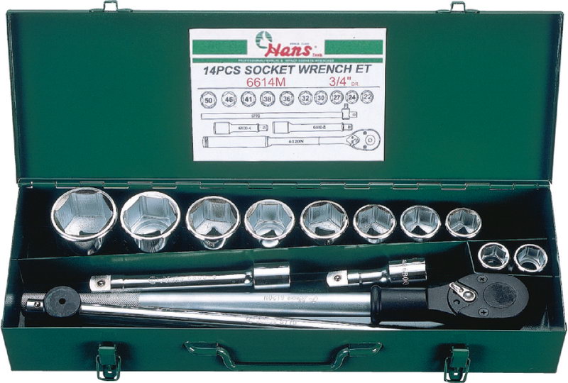 Набор 6614M 6-гранные торцевые головки с аксессуарами 3/4'', 14 предметов: 6400M Головка торцевая шестигранная 3/4'' - 22,24,27,30,32,36,38,41,46,50 мм -10 шт 6120N Трещотка с быстрым сбросом 3/4'', 500 мм 6800-4 Удлинитель 3/4'', 100 мм 6800-8 Удлинитель 3/4'', 200 мм 6770 Т-образный вороток скользящий 3/4'', 500 мм