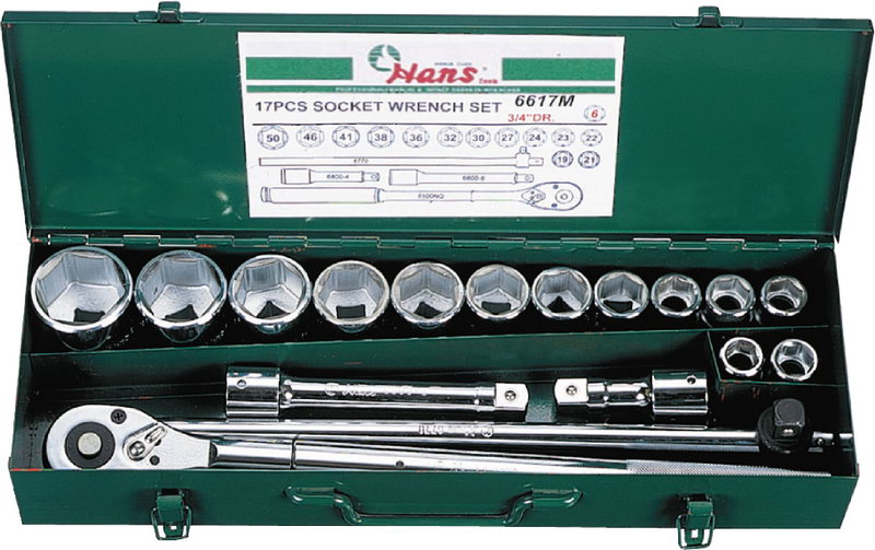 Набор 6617M 6-гранные торцевые головки с аксессуарами 3/4'', 17 предметов: 6400M Головка торцевая шестигранная 3/4'' - 19,21,22,23, 24,27,30,32,35, 36,38,41,46, 50 мм-13 шт 6100NQ Трещотка с быстрым сбросом 3/4'', 500 мм 6770 Т-образный вороток скользящий 3/4'', 500 мм 6800-4 Удлинитель 3/4'', 100 мм 6800-8 Удлинитель 3/4'', 200 мм