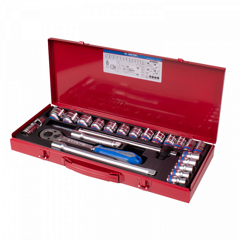 тип инструмента / наименование серия / артикул размер / количество Набор торцевых головок с принадлежностями 4028MR90 23 предмета Головки и принадлежности 1/2" Головки короткие 12-гранные 4330M 10, 11, 12, 13, 14, 15, 16, 17, 18, 19, 20, 21, 22, 23, 24, 27, 30, 32 мм Трещотка флажковая 4779-10GR 32 зубца, 250 мм Вороток скользящий Т-типа 4572-10 250 мм Удлинители 4251R 125, 250 мм Кардан 4791R 77,5 мм Упаковка Металлический кейс - 445 x 187 x 50 мм Ложемент PVC - 440 х 180 ммНазначение