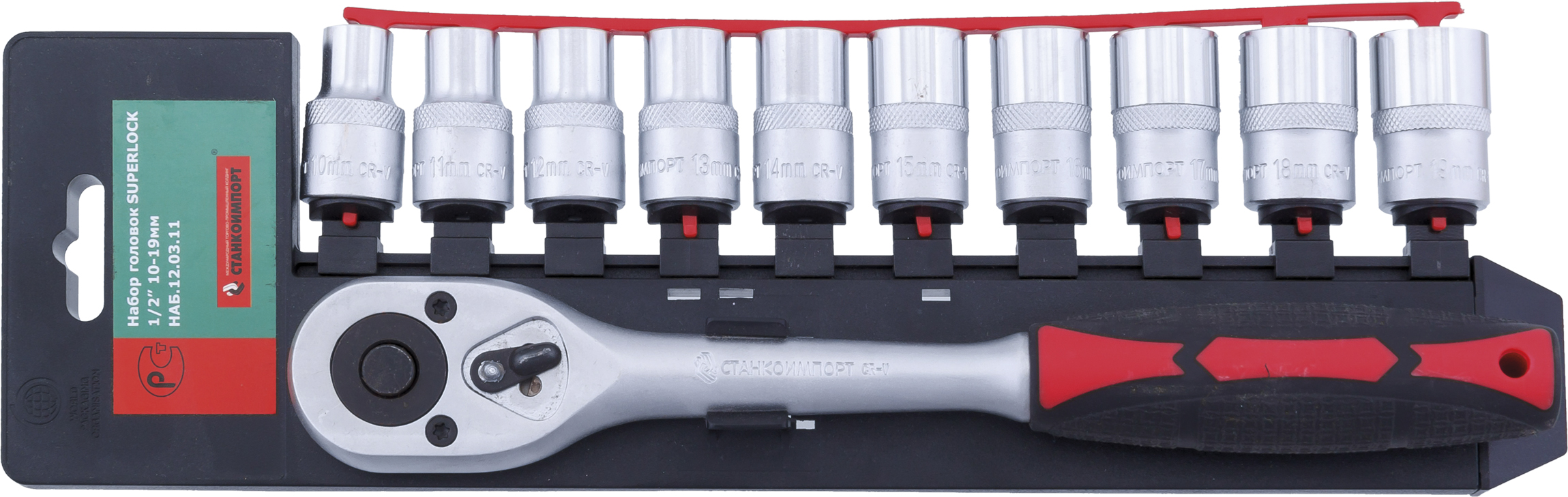 НАБ.12.03.11 Набор головок Superlock - 1 шт трещотка 1/2" - 10 шт головки торцевые шестигранные 1/2": 10, 11, 12, 13, 14, 15, 16, 17, 18, 19 мм