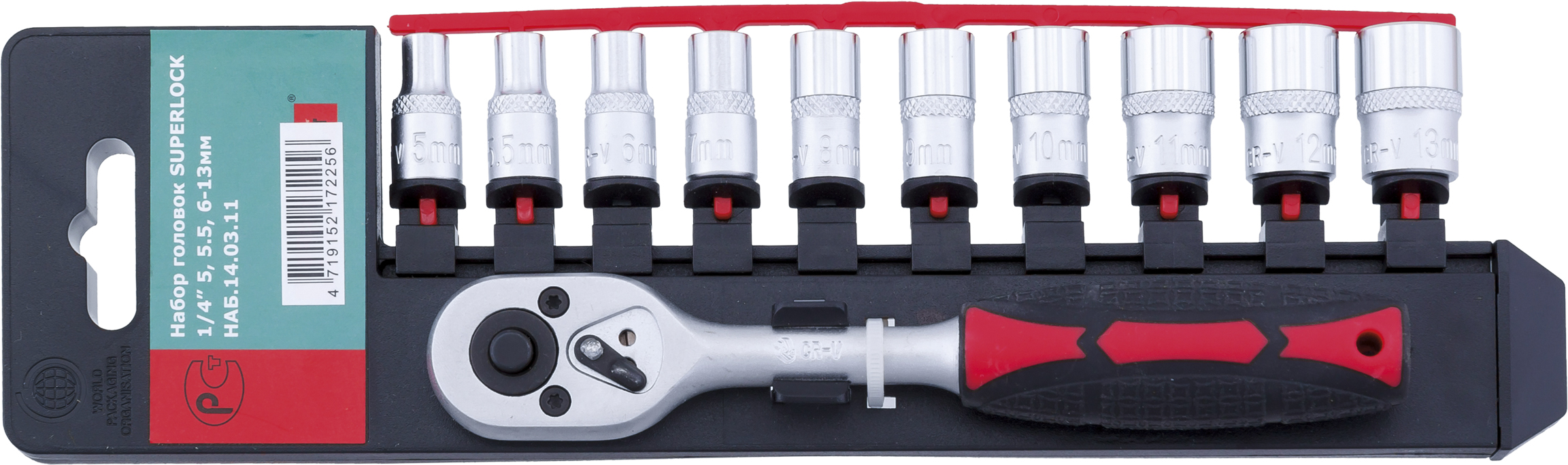 НАБ.14.03.11 Набор головок Superlock трещотка 1/4" головки торцевые шестигранные 1/4": 5, 5.5, 6, 7, 8, 9, 10, 11, 12, 13 мм