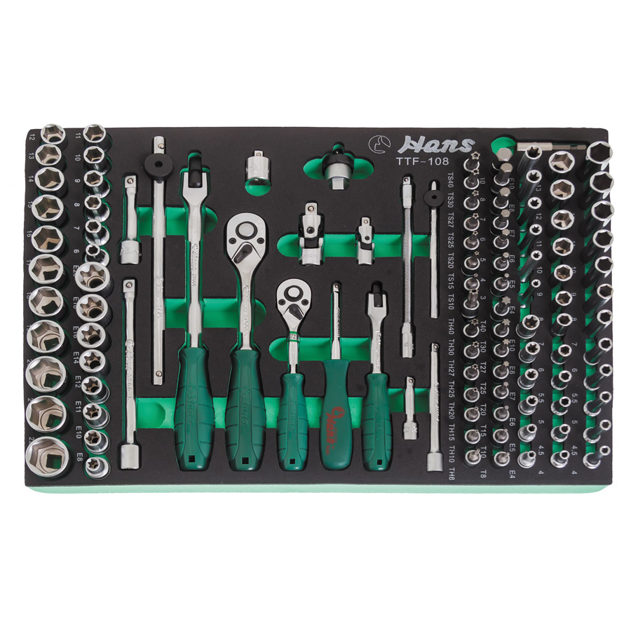 TTF-108 Набор трещоток, бит, торцевых головок и аксессуаров Hans на 1/4", 3/8", 108 предметов 2400М Головка торцевая 1/4" 4,4.5,5.5,6,7,8,9,10,11,12,13 мм 2300М Головка торцевая длинная 1/4" 4,4.5,5.5,6,7,8,9,10,11,12,13 мм 2410Е Головка торцевая Е-STAR 1/4" Е: 4,5,6,7,8,10 2300М Головка торцевая длиннаяЕ-STAR 1/4" Е: 4,5,6,7,8,10 2101GQ-72 Трещотка с быстрым сбросом 1/4" 72 зубца 125мм 2770 Вороток Т-образный 1/4" 115 мм 2700G Вороток шарнирный 1/4" 150 мм 2800-2,4 Удлинитель 1/4" 50, 100мм 2801-6R Гибкий удлинитель 1/4" 150 мм 2830 Рукоятка отверточная 1/4" 150 мм 2200 Кардан шарнирный 1/4" 40 мм 21804 Адаптер трещоточный 1/4" 13 мм 42 мм 3400М Головка торцевая 3/8" 6,7,8,9,10,11,12,13,14,15,16,17,18,19,20,21,22мм 3410Е Головка торцевая Е-STAR 3/8" Е: 8,10,11,12,14,16,18,20 3100GQ Трещотка с быстрым сбросом 3/8" 36 зубцов 200 мм 3770 Т-образный вороток 3/8" 200 мм 3700G Вороток шарнирный 250 мм 3800-3,6 Удлинитель 3/8" 3200 Кардан шарнирный 3/8" 50 мм 3805 Адаптер переходник 3/8" - 1/4" 26 мм 2025 Головка торцевая со вставкой TORX с отверстием 1/4" 32 мм ТН 8,10,15,20,25,27,30,40 2024Т Головка торцевая со вставкой TORX 1/4" 32 мм Т 8,10,15,20,25,27,30,40 20255 Головка торцевая со вставкой PENTA STAR 1/4"32 мм ТS 10,15,20,25,27,30,40 0462-2 Битодержатель 1/4" 50мм Наполнить свою тележку