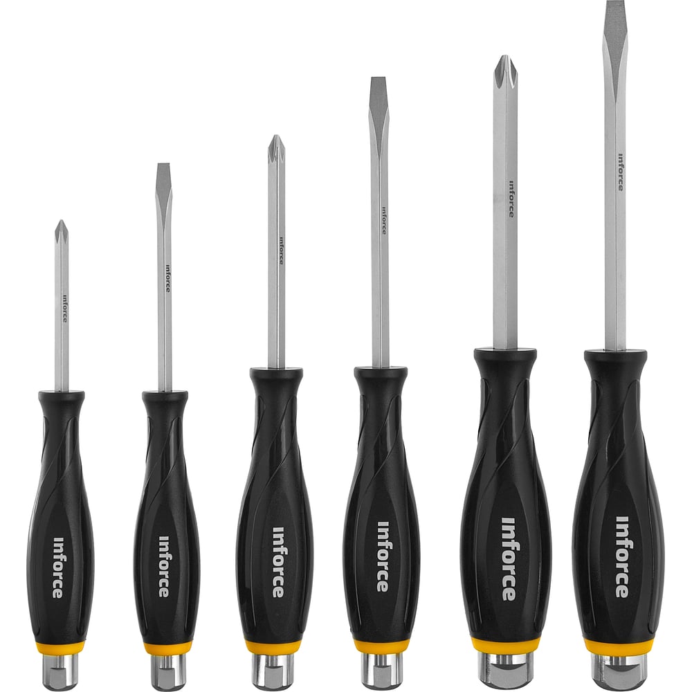 Набор ударных отверток 6 шт Inforce 06-09-91 подходит для монтажа и демонтажа сложного крепежа с большим усилием. Если усилия ладони недостаточно, можно использовать гаечный ключ, установив его на специальный шестигранник у основания стержня.
