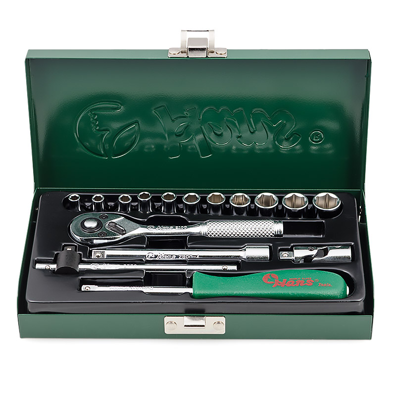 Набор универсальный 1/4", 16 предметов: - Головка торцевая шестигранная 4,4..5,5,5,6,7,8,9,10,11,12 мм – 11 шт - Трещотка с быстрым сбросом 125мм - Вороток шарнирный 150мм - Т-образный вороток скользящий 115 мм - Удлинитель 100 мм - Шарнир карданный