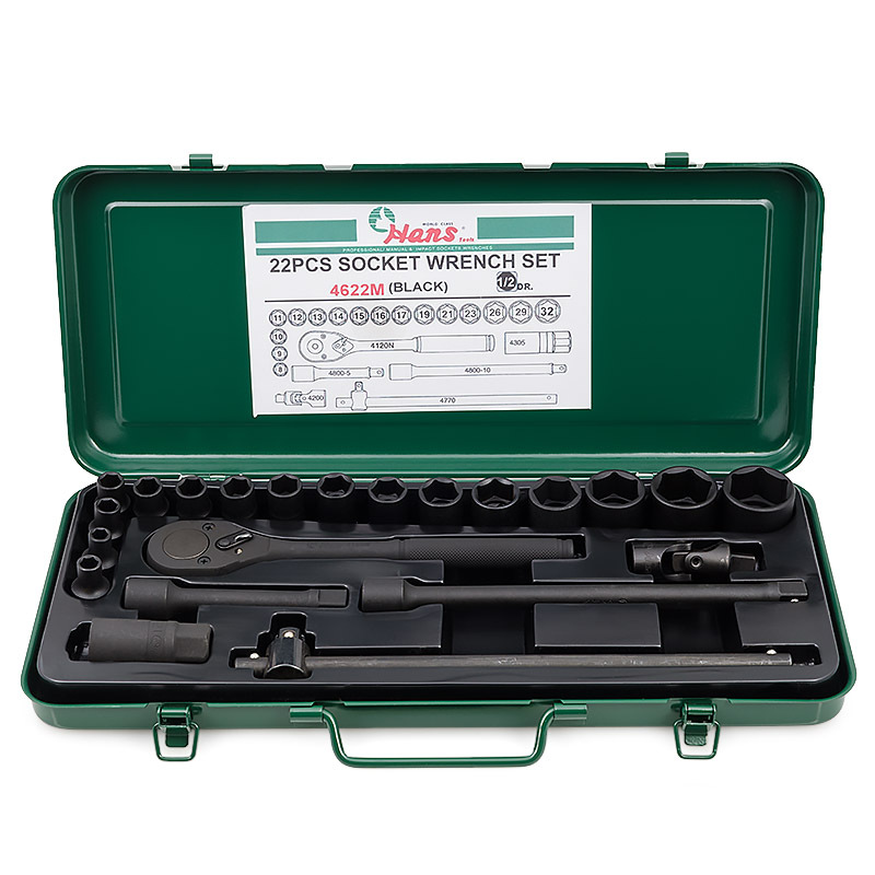 Набор 6-гр. Головок 1/2'', 8-32 мм, 22 предмета, BLACK Головки торцевые (8, 9, 10, 11, 12, 13, 14, 15, 16, 17, 19, 20, 21, 23, 26, 29, 32 мм) – 17 шт Ключ трещоточный, длина 250 мм – 1 шт Шарнир карданный, длина 70 мм – 1 шт Головка свечная 20.8 мм – 1 шт Т-образный вороток, длина 300 мм – 1 шт Удлинитель, длина 125 мм – 1 шт Удлинитель, длина 250 мм – 1 шт