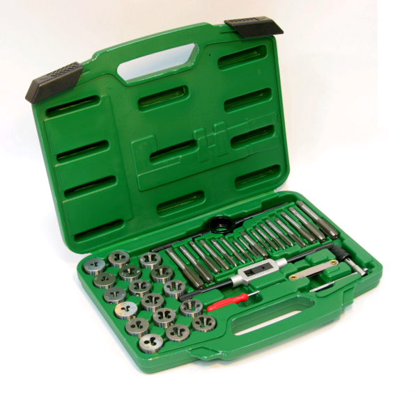 Набор метчиков и плашек 40 предметов Состав: вороток для метчиков М3-М12 Т-образный вороток для метчиков вороток для плашек 25мм отвертка для клуппа щуп резьбовой плашки: м3х0.5, м3x0.6, м4х0.7, м4х0.75, м5х0.8, м5х0.9, м6х0.75, м6х1.0, м7х0.75, м7х0.75, м7х1.0, м8х1,0, м8х1.25, м10х1.25, м10х1.5, м12х1.5, м12х1.75 метчики: м3х0.5, м3x0.6, м4х0.7, м4х0.75, м5х0.8, м5х0.9, м6х0.75, м6х1.0, м7х0.75, м7х0.75, м7х1.0, м8х1,0, м8х1.25, м10х1.25, м10х1.5, м12х1.5, м12х1.75