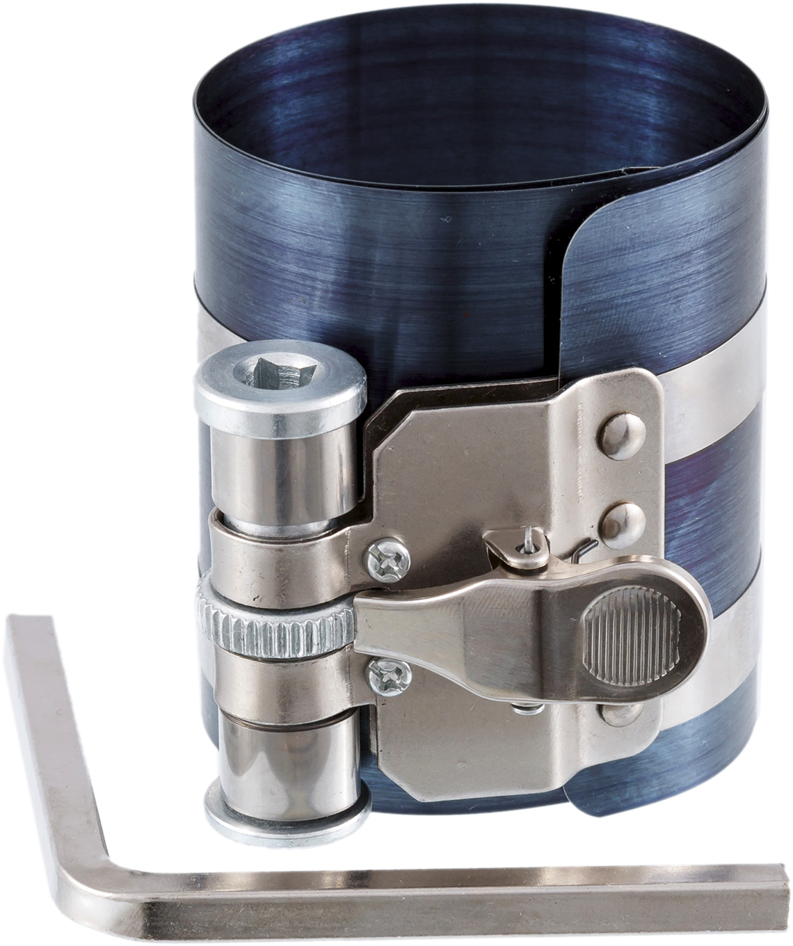 KA-2034 Оправка поршневых колец ∅ 53-125 мм, h=100 мм. Применяется при установке поршней в цилиндры. Особенности: Значительно упрощает установку поршня в цилиндр. Позволяет сжать поршневые кольца до диаметра, меньшего, чем внутренний диаметр цилиндра. Надёжный трещоточный механизм фиксации. Кнопка разблокировки трещоточного замка. Удобная рукоятка сжатия оправки. Комплектность: Оправка поршневых колец - 1 шт. Коробка картонная - 1 шт.