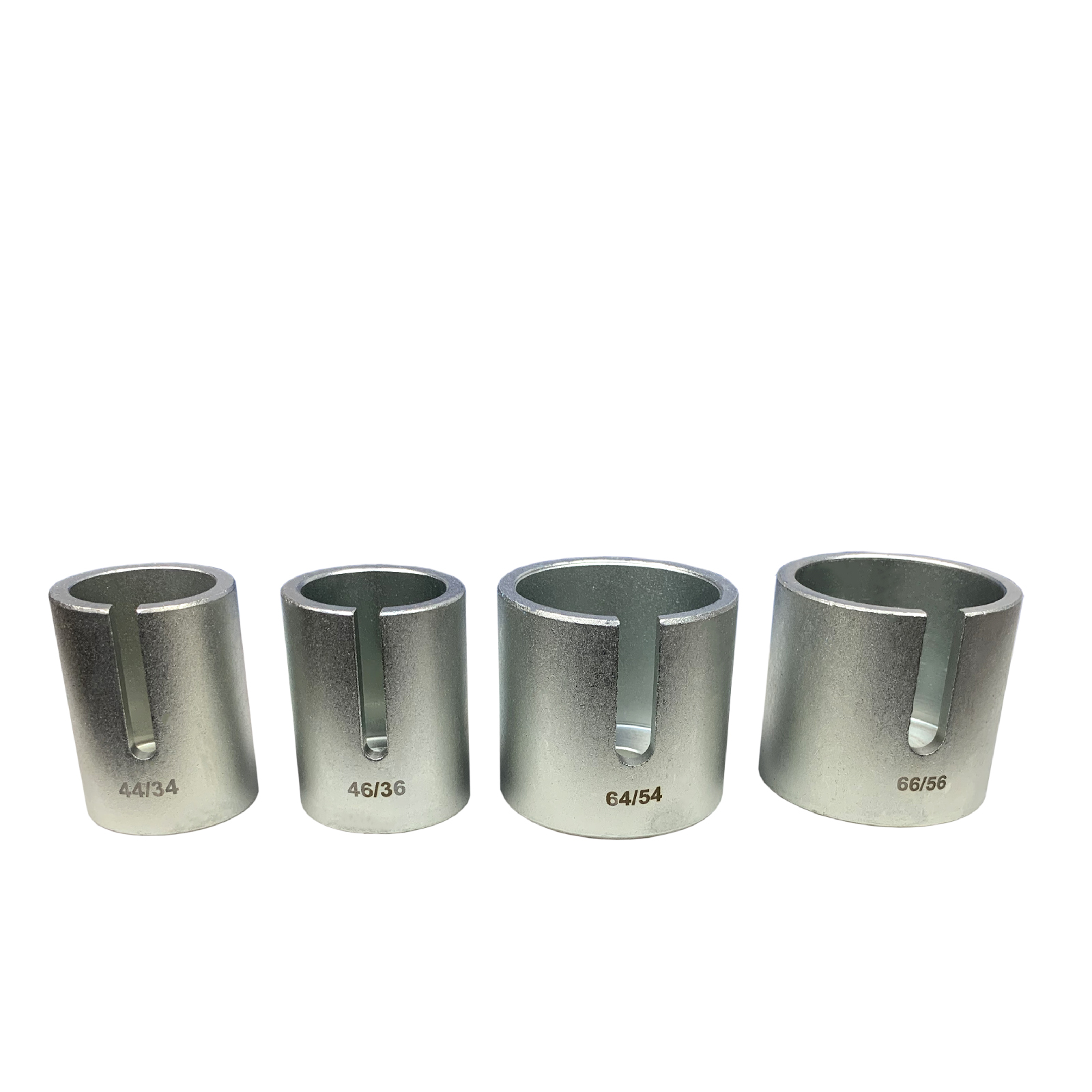 - В комплекте внутренние втулки диаметром 34, 36, 38, 40, 42, 44, 46, 48, 50, 52, 54, 56, 58, 60, 62, 64, 66, 68, 70, 72 мм, внешние 44, 46, 48, 50, 52, 54, 56, 58, 60, 62, 64, 66, 68, 70, 72, 74, 76, 78, 80, 82 мм.