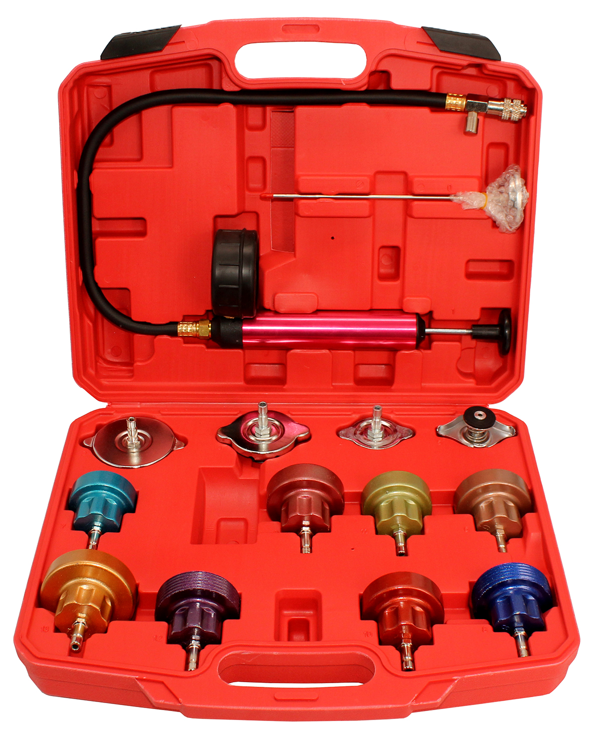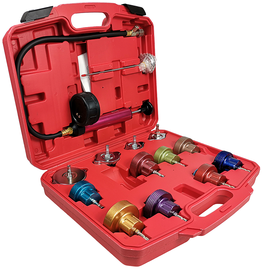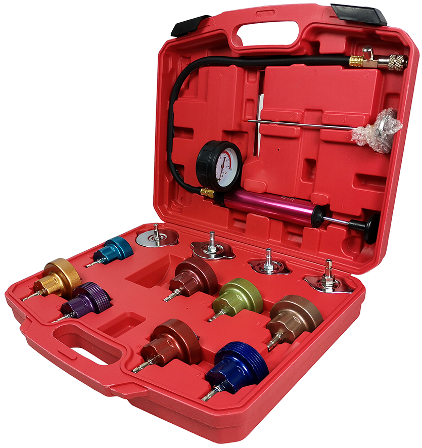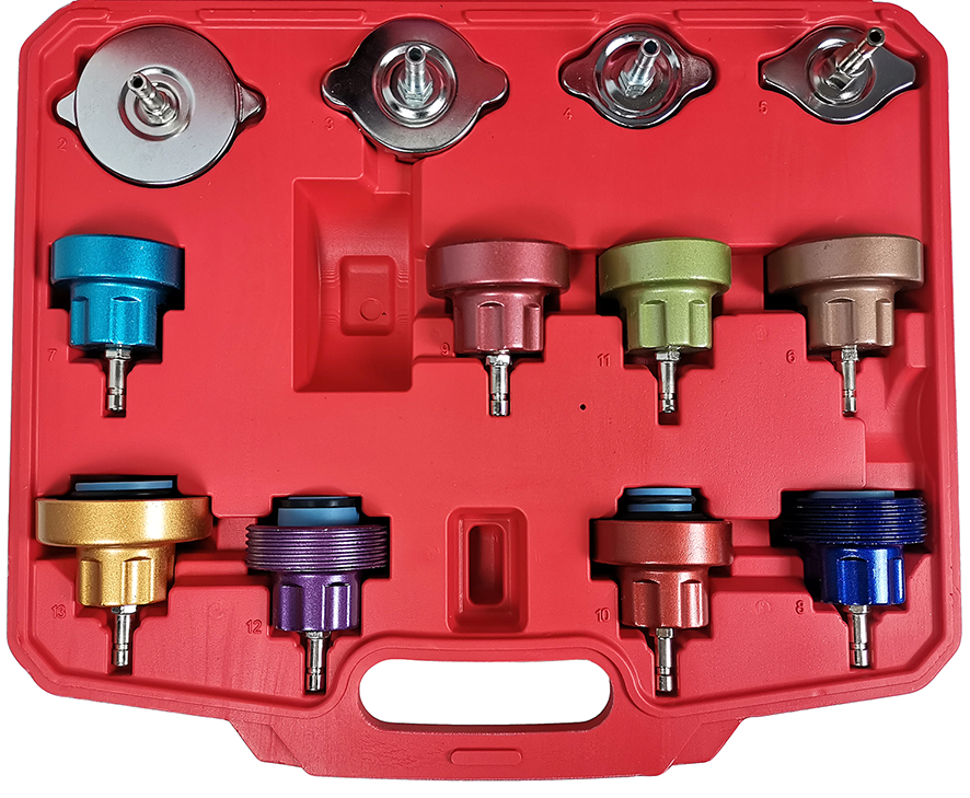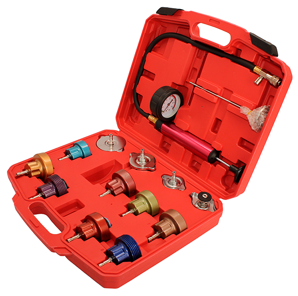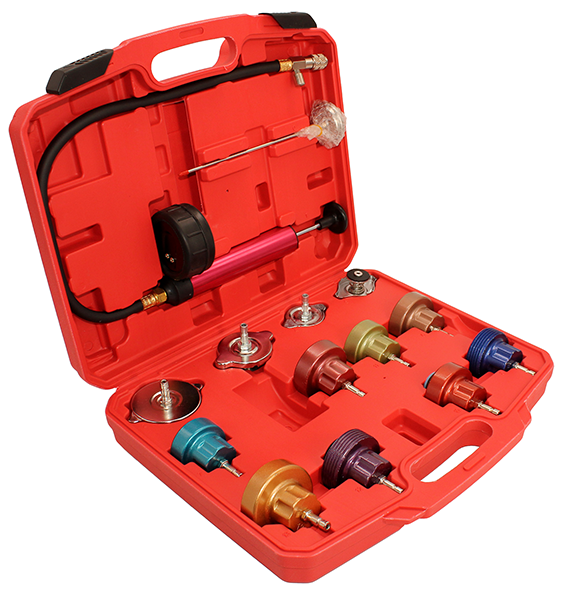 Опрессовка TA-G1001 применяется при работе с системами охлаждения двигателей разных производителей. Комплект состоит из 12 адаптеров различных стандартов, насоса с манометром, термометра и удобного пластикового кейса.