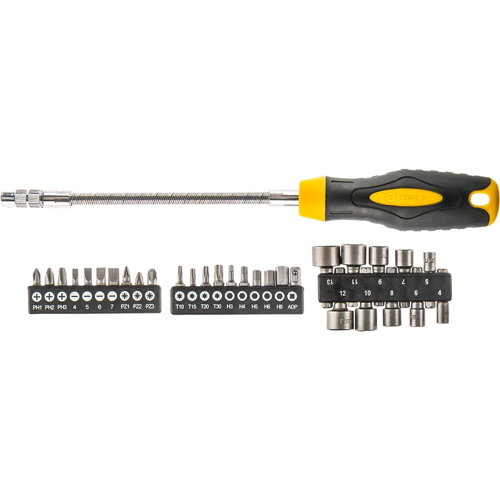 Отвертка с гибким стержнем TOPEX 39D865 предназначена для монтажа и демонтажа резьбового крепежа. Гибкий стержень позволяет работать в труднодоступных местах. Набор состоит из 31 предмета, за счет чего он может работать практически с любыми шлицами. Для удобства работы предусмотрено магнитное жало. Устойчивая к коррозии и деформации хромованадиевая сталь обеспечивает длительный срок службы инструмента. Удобная пластиковая рукоятка покрыта антискользящим материалом для комфорта и безопасности во время работы.
