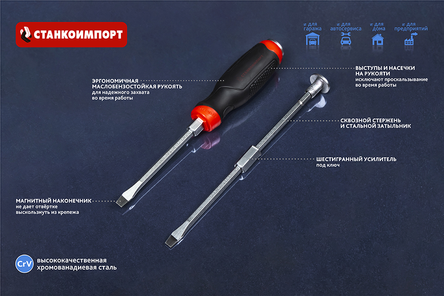 body{margin:0;padding:8px;} p{line-height:1.15;margin:0;white-space:pre-wrap;} ol,ul{margin-top:0;margin-bottom:0;} img{border:none;} li>p{display:inline;} Назначение Отвертка предназначена для завинчивания/отвинчивания крепежных элементов вручную, имеющих внутренний рабочий профиль там, где требуется дополнительное усилие. Применение На станциях технического обслуживания автомобилей, в автосервисах и автомастерских, для домашнего использования или профессиональных ремонтно-монтажных работ. Особенности Отвертка изготовлена из высококачественной легированной хром-ванадиевой инструментальной стали, с последующей закалкой до твердости в пределах 46-48HRC, что соответствует всем требования нормативной документации. Наконечник проходит дополнительную термическую обработку с целью получения оптимального сочетания твердости и пластичности. Сквозная посадка стержня и металлический затыльник позволяют применять ударное воздействие. Шестигранный профиль у основания рукояти позволяет посредством ключа существенно увеличить усилие, передаваемое крепежу. Отвертка снабжена двухкомпонентной эргономичной рукоятью. Благодаря высококачественным компонентам рукоять имеют высокую стойкость к агрессивным средам. Качество Защиту от коррозии обеспечивает специальное хром-никелевое покрытие. Гарантия На отвертки бренда СТАНКОИМПОРТ распространяется гарантия 12 месяцев.