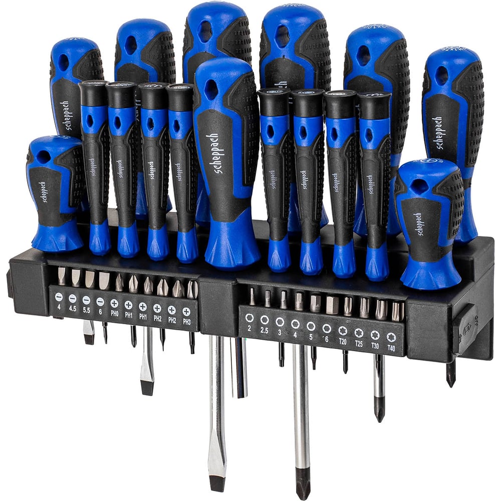 Набор отверток и бит Scheppach — это универсальное решение для дома, мастерской и профессионального использования. Он идеально подходит для ремонта бытовой техники, сборки мебели, работы с электроникой и автомобилями. В комплект входят классические отвертки, прецизионные модели для мелких деталей, а также широкий набор бит под популярные типы крепежа.Удобное размещение: Все элементы удобно размещены на прочной подставке, которую можно повесить на стену, обеспечивая порядок и доступность.Эргономичные ручки: Двухкомпонентные ручки с противоскользящим покрытием обеспечивают комфорт и надёжный хват при работе.Прецизионные отвертки с Torx и PH00/PH0 Эти миниатюрные инструменты позволяют работать с электроникой, часами, очками и мелкими механизмами, где обычные отвертки не подойдут. Особенно полезны для ремонта смартфонов, ноутбуков и бытовой техники.Биты с редкими размерами — SL4.5, PH3, T40, H2.5 Эти нестандартные размеры часто встречаются в импортной технике и мебели, но редко входят в базовые наборы. Их наличие избавляет от необходимости докупать отдельные насадки.Битодержатель в комплекте Позволяет использовать биты с любыми совместимыми рукоятками или шуруповёртами, расширяя функциональность набора.Стандартные отвертки длиной до 150 мм Удлинённые модели (SL8×150, PH3×150) обеспечивают доступ к глубоко расположенным винтам, особенно в корпусах техники и мебели.
