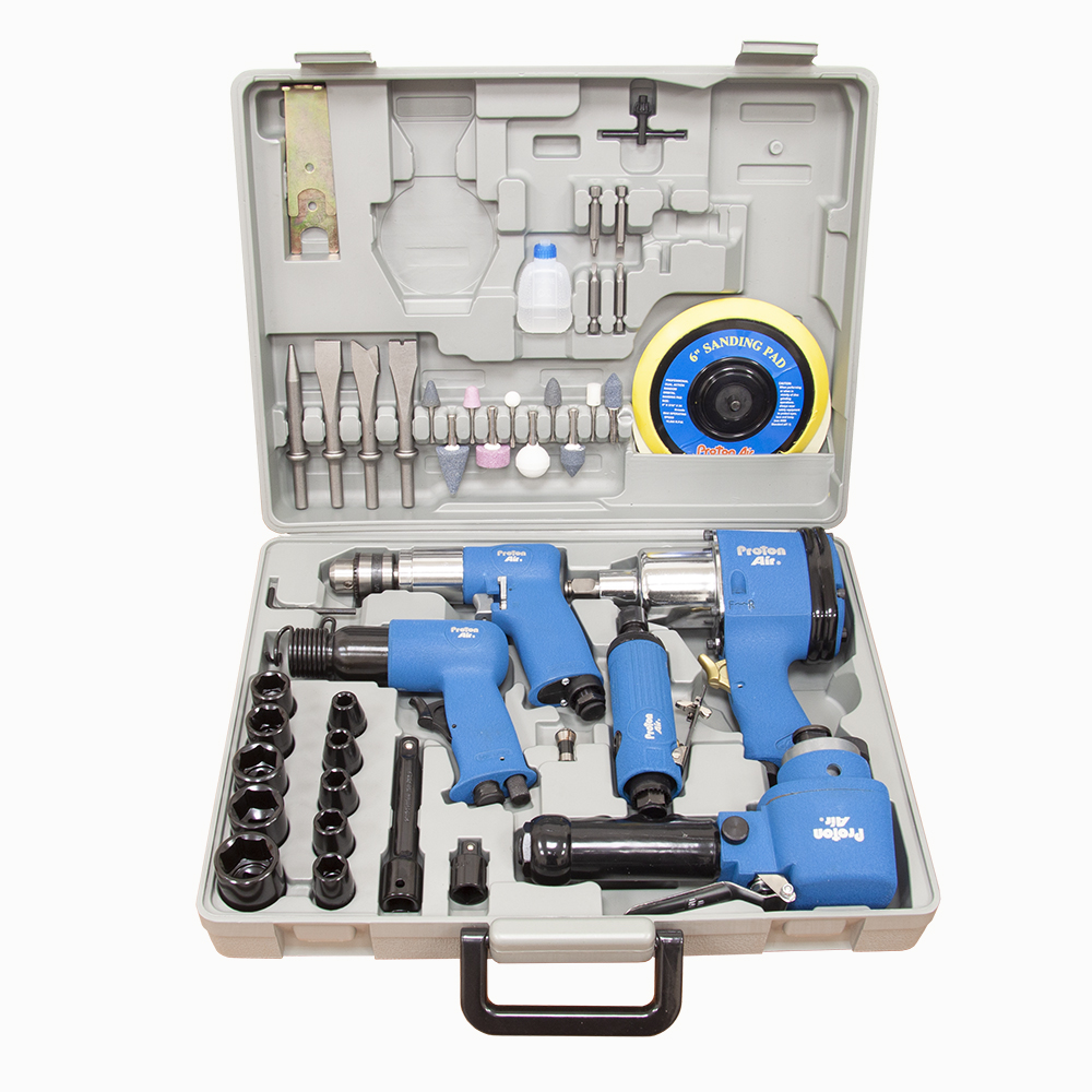 PA-ATK-52HD Состав: пневматический ударный гайковёрт 1/2” пневмодрель 3/8” пневматическое зубило шлифовальная машина бормашина прямая плоские биты 4, 6 (2 шт) PHILLIPS биты 2,3 (2 шт) шлифовальные камни 6мм и 3мм (10 шт) зубило (4 шт) ударные головки 9-10-11-13-14-17-19-22-24-27мм (10 шт) защитная крышка отрезной диск (3”х3/8”х1 1/16”) гаечный ключ удлинитель 1/2”х5”L адаптер 12”Fх3/8”М шлифовальный круг диаметром 6” наждачная бумага 6” разъем к воздушному шлангу патрон 1/8” и 1/4” или 3мм и 6 мм масленка ключ для патрона шестигранный ключ 4мм