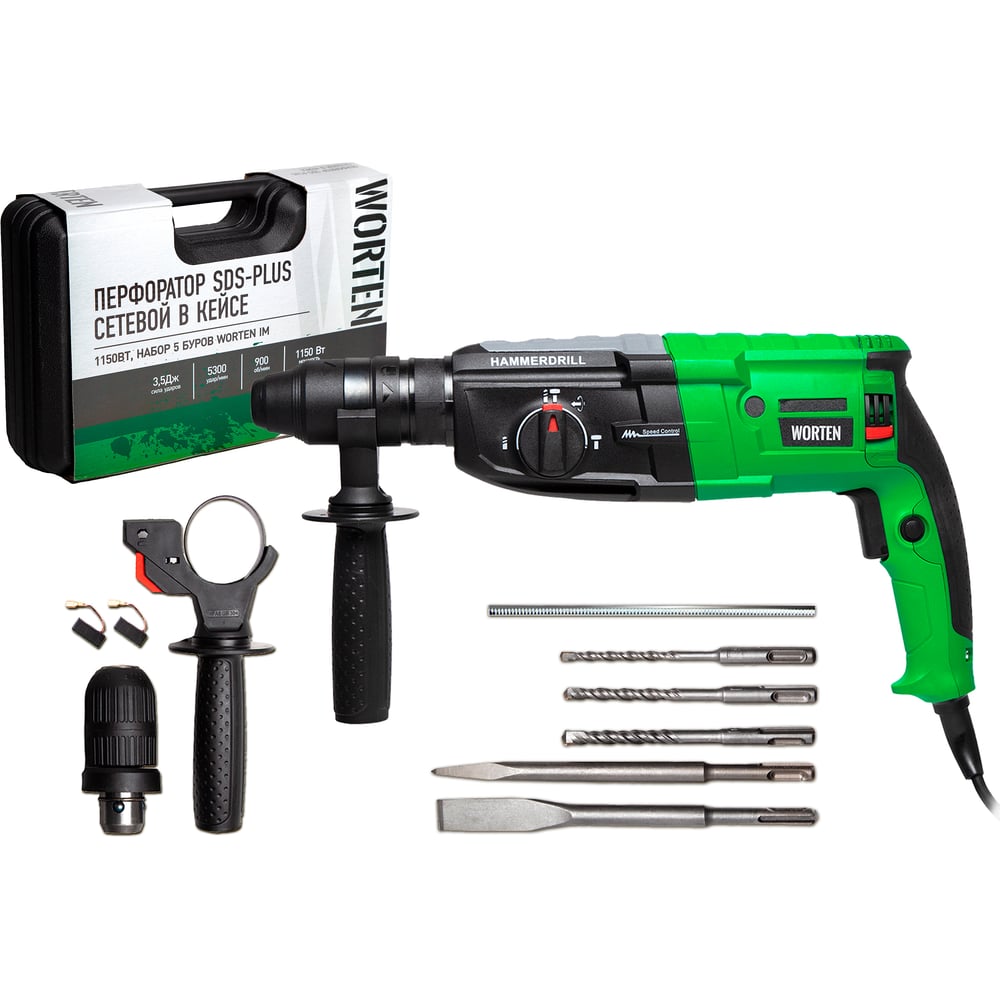 Перфоратор SDS-plus сетевой в кейсе, 1150Вт, набор 5 буров WORTEN это надежный ударный инструмент, идеально подходящий как для профессиональных, так и для домашних задач. Перфоратор спроектирован для длительной эксплуатации, он обеспечит высокую производительность и комфорт при работе с различными материалами. Он функционирует в трех режимах: сверление, ударное сверление, долбление. Режим сверления поможет сделать отверстия на податливом материале, например, в древесине. Режим ударного сверления подходит для бурения отверстий в бетоне и кирпичной кладке, а режим долбления – для проведения отбойных работ, штробления, а также при разрушении конструкции. Легкий доступ к щеткам: упростит техническое обслуживание и продлит срок службы инструмента. Удобство в использовании: Боковая рукоятка и ограничитель глубины обеспечивают точность и контроль при проведении работ. Комплект поставки включает удобный кейс, обеспечивающий удобство хранения и транспортировки перфоратора, а также широкий ассортимент насадок для выполнения разнообразных задач. Перфоратор электрический ударный – оптимальное решение для тех, кто нуждается в надежном и качественном инструменте для комплексных строительных и ремонтных работ.