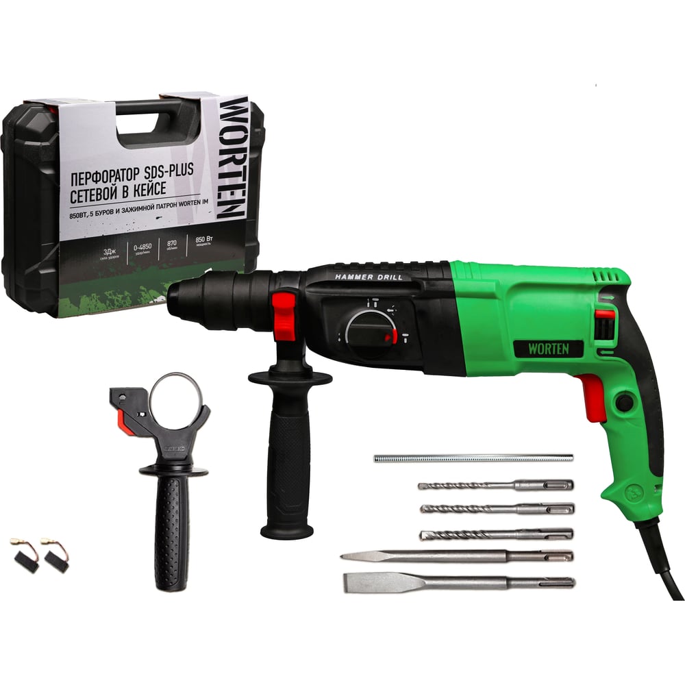 Перфоратор SDS-plus сетевой в кейсе с набором 5 буров и зажимным патроном 850Вт WORTEN это надежный ударный инструмент, идеально подходящий как для профессиональных, так и для домашних задач. Перфоратор спроектирован для длительной эксплуатации, он обеспечит высокую производительность и комфорт при работе с различными материалами. Он функционирует в трех режимах: сверление, ударное сверление, долбление. Режим сверления поможет сделать отверстия на податливом материале, например, в древесине. Режим ударного сверления подходит для бурения отверстий в бетоне и кирпичной кладке, а режим долбления – для проведения отбойных работ, штробления, а также при разрушении конструкции. Легкий доступ к щеткам: упростит техническое обслуживание и продлит срок службы инструмента. Удобство в использовании: Боковая рукоятка и ограничитель глубины обеспечивают точность и контроль при проведении работ. Комплект поставки включает удобный кейс, обеспечивающий удобство хранения и транспортировки перфоратора, а также широкий ассортимент насадок для выполнения разнообразных задач. Перфоратор электрический ударный – оптимальное решение для тех, кто нуждается в надежном и качественном инструменте для комплексных строительных и ремонтных работ.