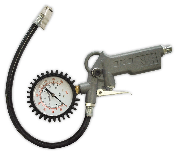 Пистолет для накачки шин с манометром и клапаном аварийного сброса сжатого воздуха. Упаковка в блистере. Вес брутто: 0.39 кг