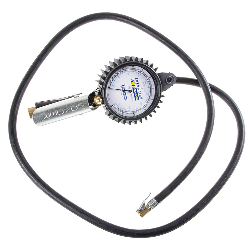 Он оснащён профессиональным манометром EURODAINU с увеличенным диаметром 85 мм и пределами измерений от 0 до 12 бар (атмосфер). Манометр откалиброван, он отличается высокой точностью показаний, имеет легко читаемую шкалу двух цветов. Черная шкала показывает давление в bar, красная шкала показывает давление в psi. Точность измерения 0,1 bar. Стрелка манометра не имеет механического ограничителя. Благодаря этому она возвращается на ноль при отсутствии подачи воздуха, что демонстрирует исправность манометра.