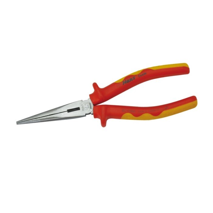 1838-06 плоскогубцы с длинными губками для электрика, 160 мм Диэлектрические плоскогубцы Hans — это высокачественный инструмент применяющий для широкого спектра электромонтажных работ. Особенности: - Применяются для работ под напряжением до 1000В. - Материал рукояток: двухслойный диэлектрический пластизоль. Внутренняя изоляция - желтого цвета, внешний слой изоляции - красного цвета. - Режущие кромки дополнительно закалены токами высокой частоты. HRC 62 - Материал рабочей части: инструментальная хром-ванадиевая сталь - Резка твердой стальной проволоки диаметром до 1.5 мм - Инструмент имеет обработку поверхности: матовое никелирование Пассатижи Hans соответствуют жестким требованиям стандартов ГОСТ и МЭК.