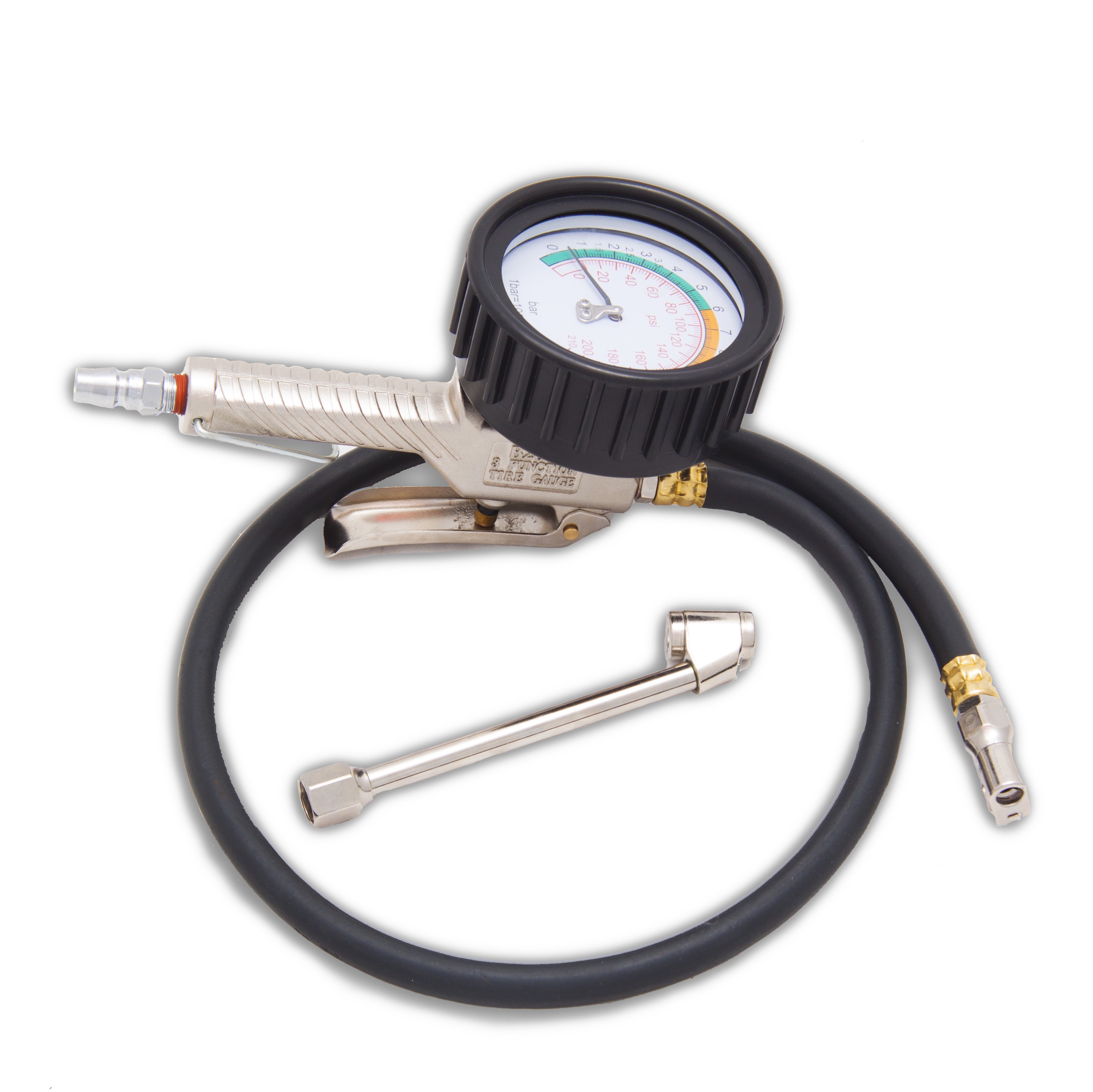 Пневматическая подкачка шин с манометром. 3-х функциональный: проверка давления, сброс давления до нужного значения, накачка до нужного значения Крупная легкочитаемая шкала Поворотный манометр на шарнирном соединении Насадка для подкачки колес Рабочий диапазон 200 PSI Длина шланга: 850 мм