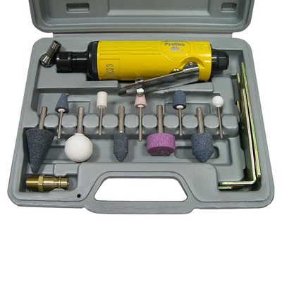 PA-5003KM Пневмодрель с шарошками. Пневмодрель с шарошками (бормашинка) широко используется в автосервисах, шиномонтажных мастерских, на производстве и в бытовых нуждах. Применяется для зачистки сварных швов, удаления заусенцев, шлифования поверхностей перед склеиванием. Корпус бормашинки с анти-скользящим покрытием. Клавиша включения снабжена блокиратором. (Подача воздуха прекращается автоматически при отпускании инструмента) Особенности: Частота вращения на холостом ходу 20 000 об/мин Размер цанговых патронов 3 мм, 6 мм Размер воздушного штуцера 1/4" Рекомендуемый диаметр воздушного шланга 10 мм Рекомендуемое давление воздуха 6,2 атм Расход воздуха 170 л/мин Максимальный уровень шума 96 dB Длина 170 мм Комплект набора: Бормашинка прямая 170 мм (20 000 об/мин) - 1 шт. Шарошки с хвостовиком 3 мм - 5 шт. Шарошки с хвостовиком 6 мм - 5 шт. Цанговый патрон 3 мм - 2 шт. Цанговый патрон 6 мм - 2 шт. Штуцер воздушный быстросъём - 1 шт. Ключи для фиксации шарошек - 2 шт. Кейс для хранения - 1 шт. Инструкция - 1 шт. Обязательно используйте блок подготовки воздуха (осушитель, лубрикатор и регулятор давления)! При работе инструментом, соблюдайте технику безопасности! Обязательно используйте средства индивидуальной защиты органов слуха и дыхания, а так же защитные очки.