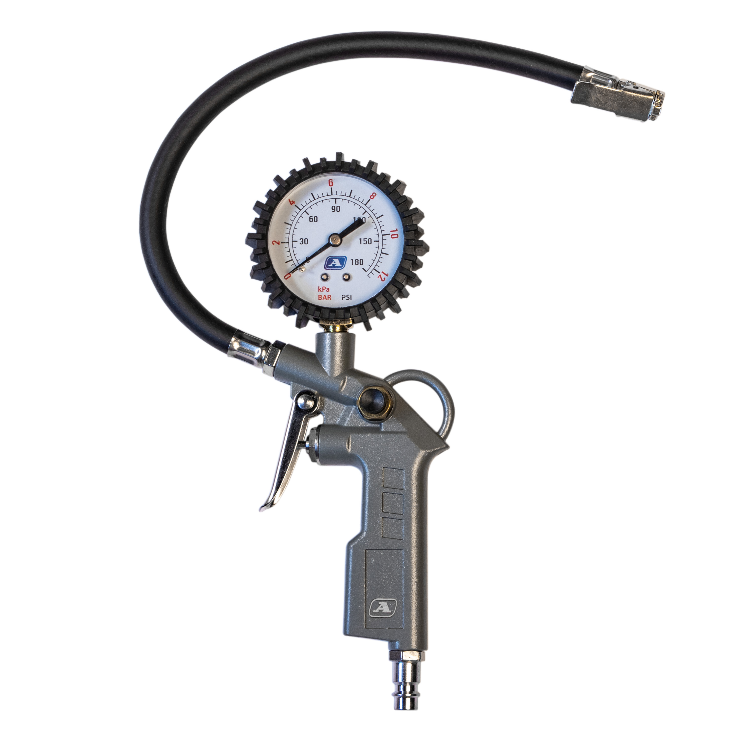 Пневмопистолет для накачки TG используется для наполнения шин и прочих емкостей воздухом. Рабочий диапазон давления составляет от 0 до 10 бар. Текущий уровень давления можно определить с помощью встроенного манометра. Металлический корпус отличается хорошей устойчивостью к механическим повреждениям. Оснащен быстросъемным переходником для подключения сжатого воздуха.