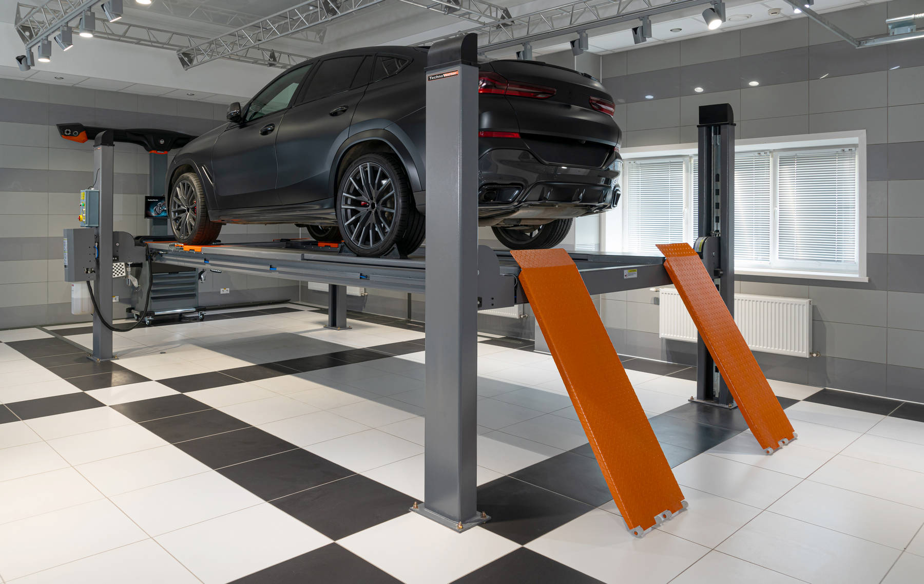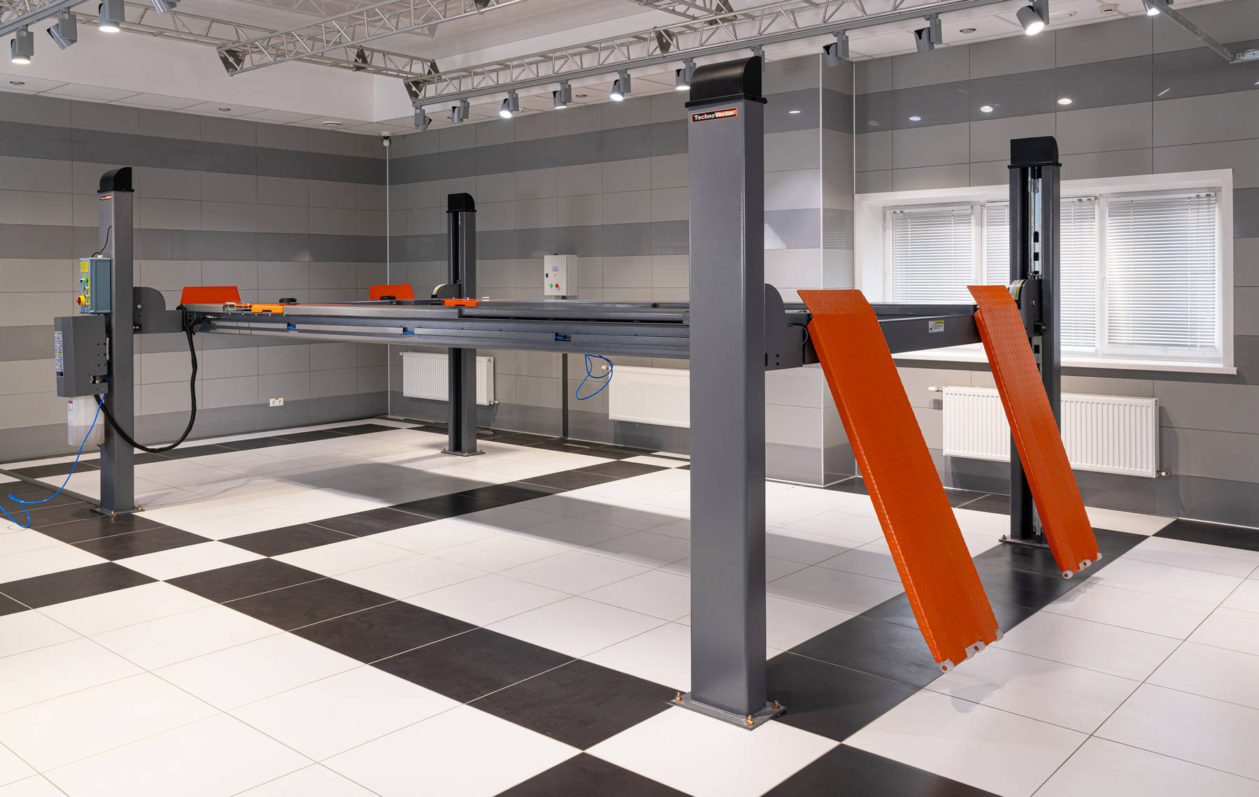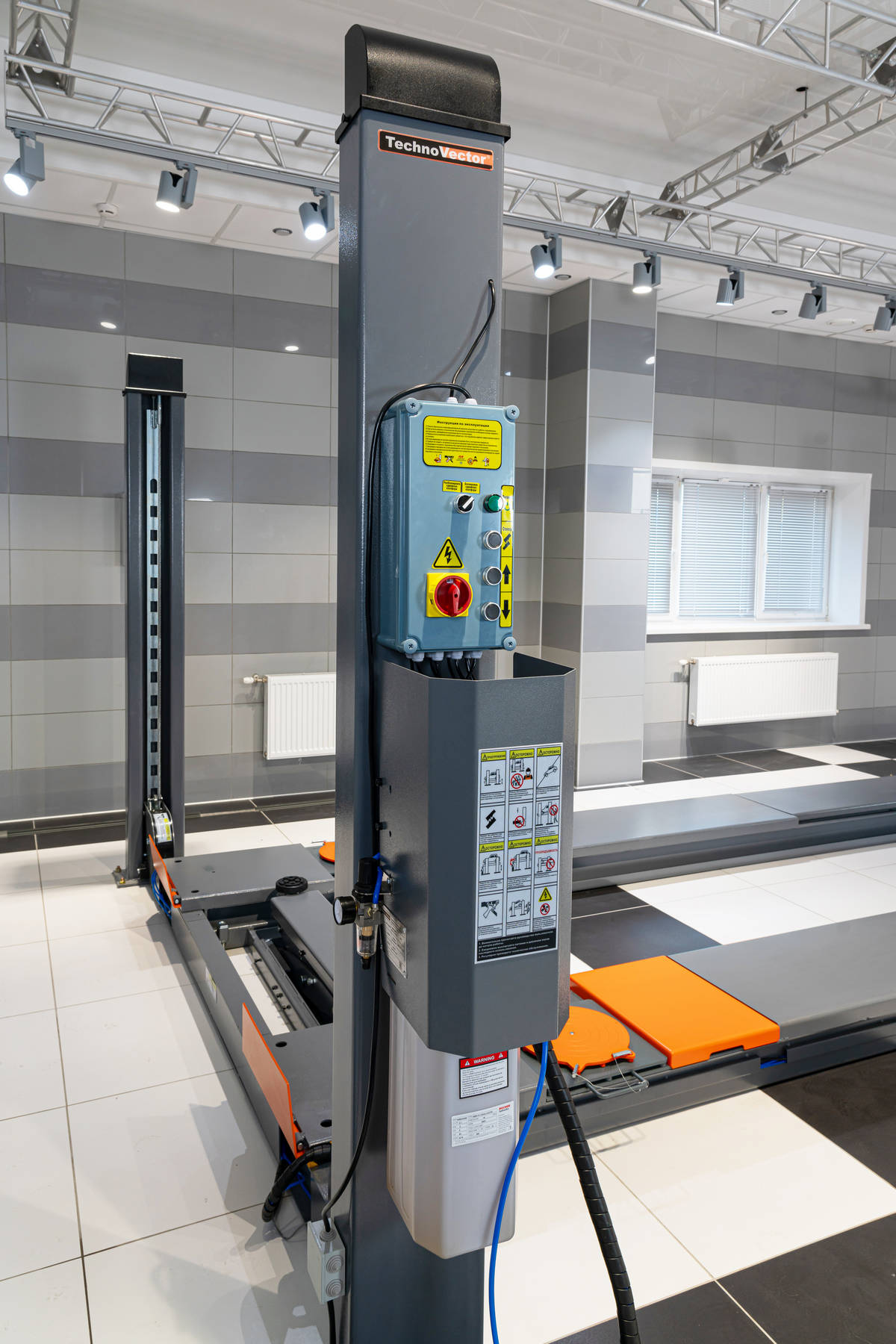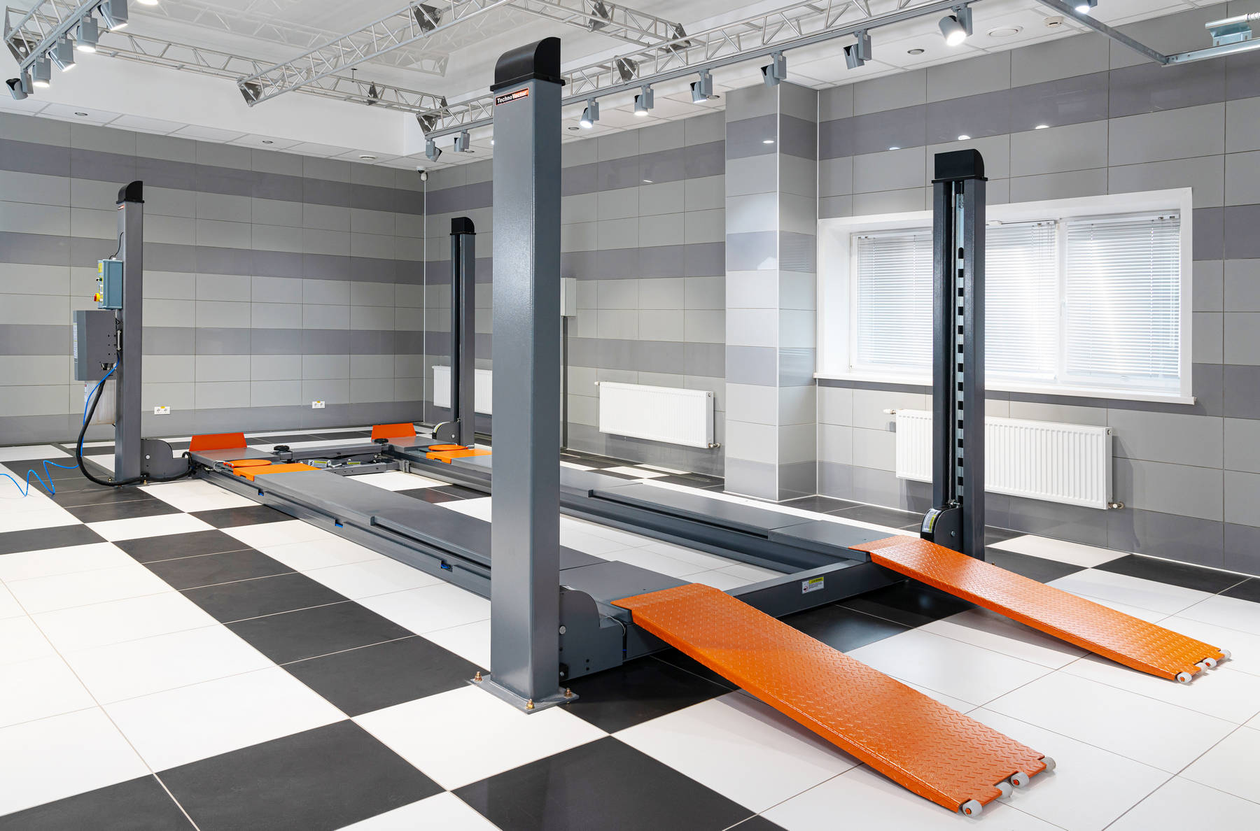С пневмоблокировкой платформ. Для авто до 5 тонн. Высота подъёма 1700 мм