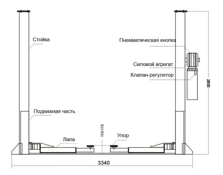 - Система стопоров удерживает положение каретки при работе с автомобилем и автоматически страхует ее при подъеме.