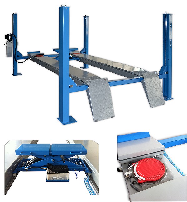 Электрогидравлический подъемник с комплектом для "развал-схождения" для обслуживания легковых автомобилей и легких грузовиков.