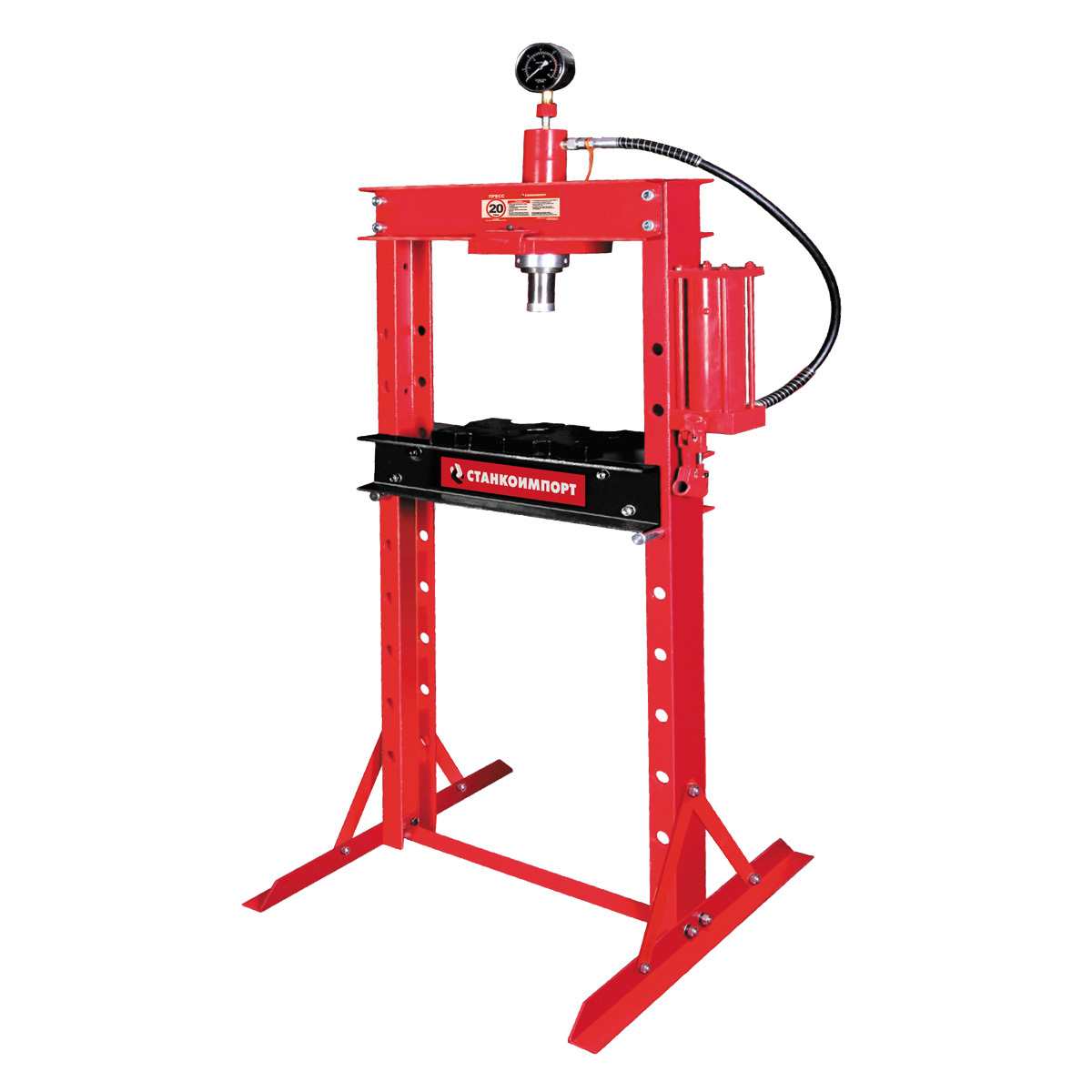 Преимущества: • Предназначен для снятия и установки шкивов, поршневых пальцев, универсальных соединений, распрямления, сгибания и соединения деталей • Устойчивая напольная установка • Регулируемая по высоте опора • Наличие встроенного манометра • Удобное ручное управление • Долговечная порошковая окраска • Соответствует требованиям директив Евросоюза Характеристики: Усилие: 20 т Ход штока: 185 мм Рабочее пространство: 0-910 мм Упаковочные размеры: 1 место: 780х320х140 мм (картонная коробка) 2 место: 1520х180х130 мм (картонная коробка)