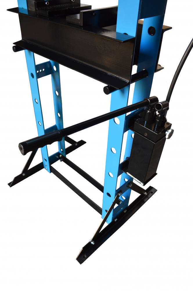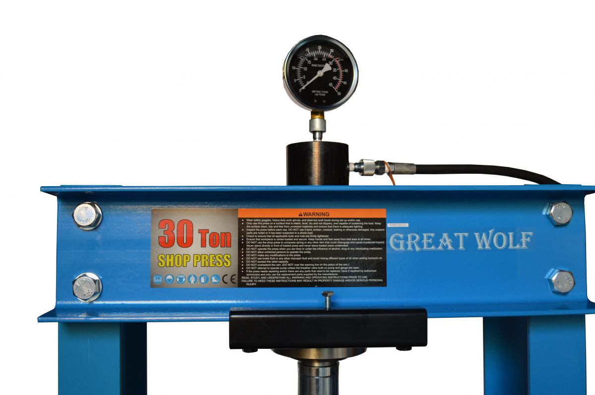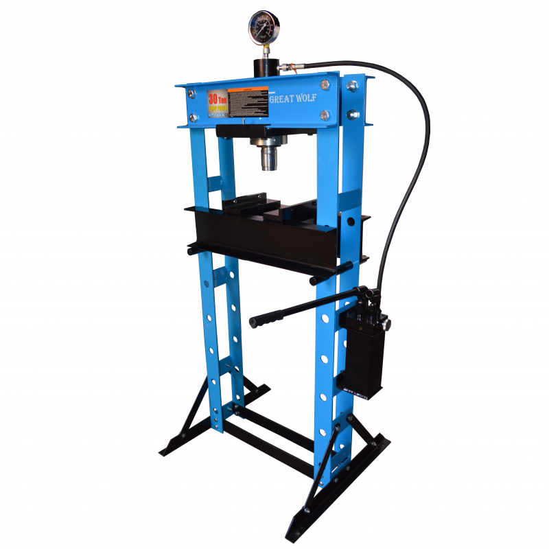Гидравлический пресс Great Wolf GW-0930 является высококачественным профессиональным, а также любительским оборудованием. Может применятся на производствах, станциях техобслуживания, мастерских. Максимальное усилие составляет 30 тонн, ход штока 155мм, регулировка нижнего упора 0-97см. Оборудован ручным приводом насоса для удобного использования. Манометр для контроля усилия. Надежная конструкция с порошковой покраской гарантирует долговечность изделия