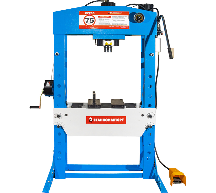 body{margin:0;padding:8px;} p{line-height:1.15;margin:0;white-space:pre-wrap;} ol,ul{margin-top:0;margin-bottom:0;} img{border:none;} li>p{display:inline;} table.blueTable {width: 100%; text-align: center; border-collapse: collapse;} table.blueTable td, table.blueTable th {border: 0px solid #AAAAAA; padding: 1px 1px;} table.blueTable tbody td { font-size: 13px;} table.blueTable thead {background: #EEEEEE;background: -moz-linear-gradient(top, #EEEEEE 0%, #cecece 66%, #EEEEEE 100%);background: -webkit-linear-gradient(top, #EEEEEE 0%, #cecece 66%, #C9C9C9 100%); background: linear-gradient(to bottom, #EEEEEE 0%, #EEEEEE 66%, #EEEEEE 100%);} table.blueTable thead th { font-size: 12px;font-weight: normal;color: #000000; text-align: center;border-left: 1px solid #EEEEEE;} table.blueTable thead th:first-child { border-left: none;} table.blueTable tfoot td {font-size: 12px;} table.blueTable1 {background-color: #FFFFFF;width: 100%; text-align: center; border-collapse: collapse;} table.blueTable1 td, table.blueTable th {border: 0px solid #AAAAAA;padding: 3px 2px;} table.blueTable1 tbody td {font-size: 13px;} table.blueTable1 tr:nth-child(odd) {background: #EEEEEE;} table.blueTable1 tfoot td {font-size: 14px;} table.blueTable1 tfoot .links { text-align: right;} table.blueTable1 tfoot .links a{display: inline-block;background: #1C6EA4; color: #FFFFFF; padding: 2px 8px; border-radius: 5px;} table.blueTable2 {background-color: #FFFFFF; width: 100%;text-align: left;border-collapse: collapse;} table.blueTable2 td, table.blueTable th { border: 0px solid #AAAAAA;padding: 3px 2px;} table.blueTable2 tbody td {font-size: 13px;} table.blueTable2 tr:nth-child(odd) { background: #EEEEEE;} table.blueTable2 tfoot td { font-size: 14px;} table.blueTable2 tfoot .links { text-align: right;} table.blueTable2 tfoot .links a{display: inline-block;background: #1C6EA4;color: #FFFFFF;padding: 2px 8px;border-radius: 5px;} Назначение: Гаражный пресс предназначен для запрессовки или выпрессовки втулок, коленвала, снятия или установки подшипников для автомобиля, сжатия всевозможных деталей, для гибки арматуры или листового металла. Особенности: Подвижной цилиндр. Комбинированный привод. Управление пневматическим насосом за счет педали. Ручной гидравлический насос имеет две скорости. Лебедка для перемещения рабочего стала. Устойчивость манометра к колебаниям давления за счет наполнения компенсирующей жидкостью. Сварная рама пресса увеличивает срок службы. Ширина (А) Глубина (B) Высота рамы(С) Общая высота(D) Горизонтальное смещение цилиндра(M) Ход станины (F1-F2) Ширина рабочего стола(Е) 1146 800 1840 1925 260 170-884 800 Основные характеристики Усилие, т 75 Исполнение напольный Привод насоса ручной/пневмо Ход поршня, мм 250 Упаковка: Длина, см 110 Ширина, см 32 Высота, см 211 Вес, кг 498