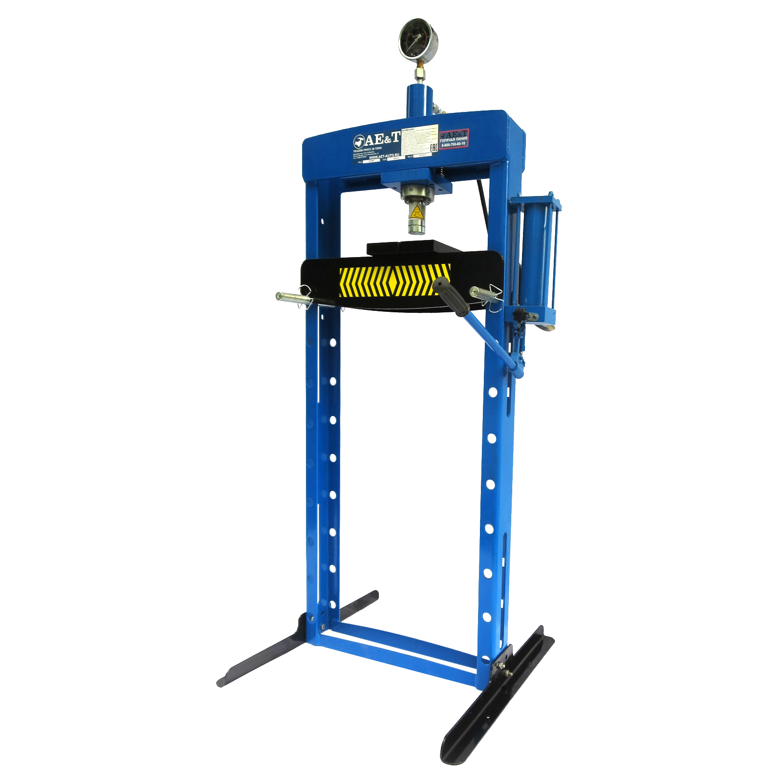 Данная модель изготовлена с учётом пожеланий сервисов и мастерских: цилиндр можно смещать на 240 мм вправо или влево от центра конструкции, сварная рама обеспечивает хороший запас прочности, установлен большой стол, который можно сместить вниз и расширить высоту рабочего места до одного метра. Удобная длинная ручка с большим диапазоном движения ускоряет работы.