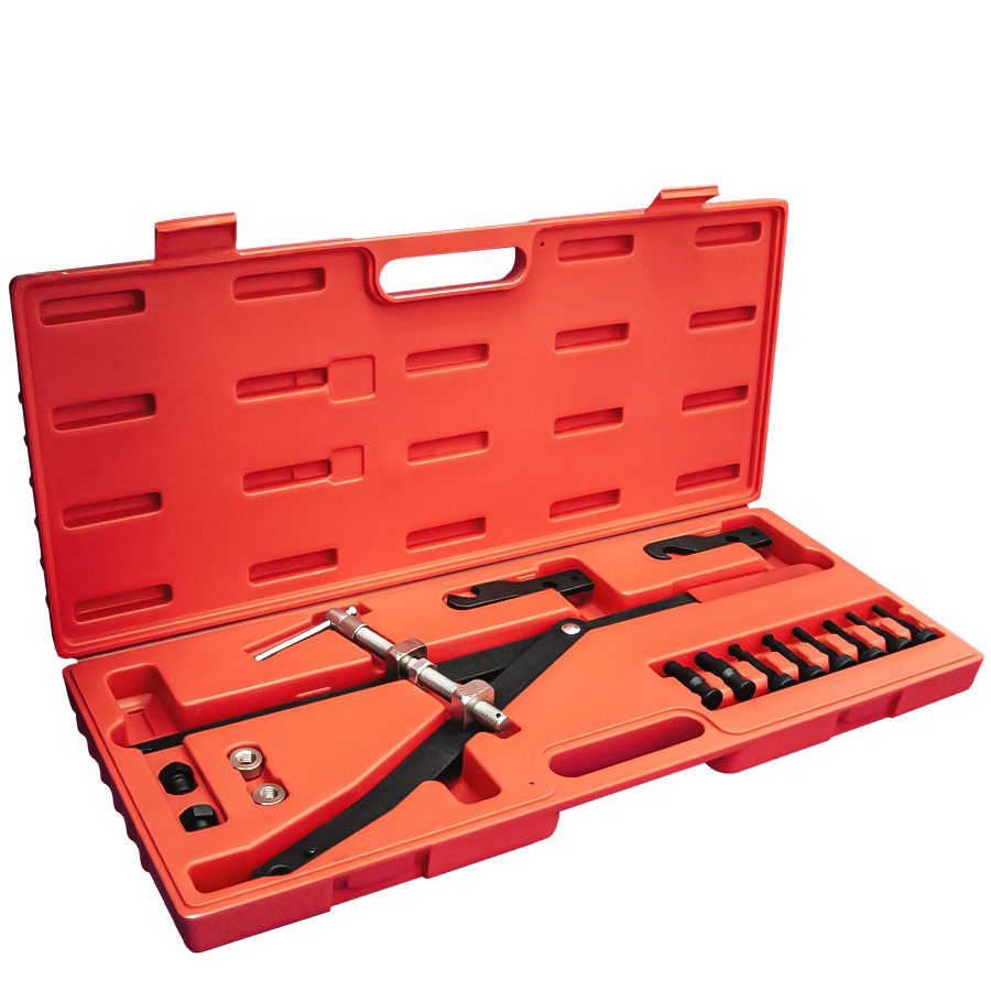 Применяется для снятия муфты вентилятора, удержания шкивов различной конфигурации. Комплект адаптеров обеспечивает совместимость с большинством автомобилей. Для более точной подгонки и надежной фиксации предусмотрен винтовой регулятор. Диапазон регулировки от 40 до 220 мм. Комплектация: Адаптеры Size available: ø6m/m – ø10m/m, ø8m/m – ø11m/m, ø10m/m – ø12m/m, ø11m/m – ø16m/m