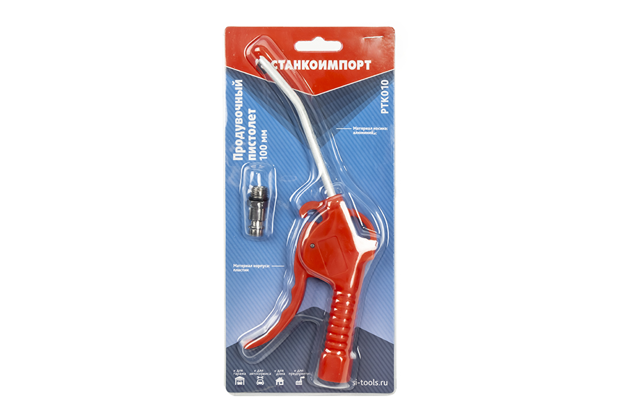 Продувочный пистолет Станкоимпорт PTK010 100мм применяется для удаления пыли, мусора и жидкостей с различных поверхностей, а также для продувки деталей. Его корпус выполнен из прочного пластика, благодаря чему рассчитан на длительный срок эксплуатации. Инструмент имеет небольшой вес, что обеспечивает комфорт при работе. Рабочее давление составляет 6.2-8 атм. Благодаря удлиненному соплу возможна работа в местах с ограниченным доступом. Отверстие для подвеса позволяет хранить инструмент в подвешенном состоянии.