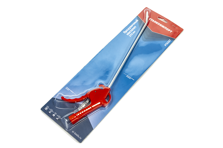 Продувочный пистолет Станкоимпорт PTK027 270 мм применяется для удаления пыли, мусора и жидкостей с различных поверхностей, а также для продувки деталей. Его корпус выполнен из прочного пластика, благодаря чему рассчитан на длительный срок эксплуатации. Инструмент имеет небольшой вес, что обеспечивает комфорт при работе. Рабочее давление составляет 6.2-8 атм. Благодаря удлиненному соплу возможна работа в местах с ограниченным доступом. Отверстие для подвеса позволяет хранить инструмент в подвешенном состоянии. В комплекте есть фитинг для подключения к воздушному шлангу.