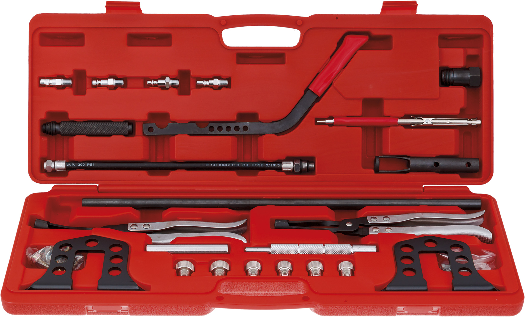 Предназначен для сжатия пружин впускных и выпускных клапанов. Особенности: Подходит для использования в большинстве отечественных и зарубежных двигателях, таких как Audi, Chrysler, Infiniti, Honda, Hyundai, Lexus, Mazda, Mitsubishi, Nissan, Porsche, Saturn, Toyota, Volvo, Volkswagen, Vaz, Gaz и многих других. Позволяет обслуживать практически любые ГБЦ за счёт универсальных держателей опорной штанги и рычага. Может использоваться как на снятой головке блока цилиндров, так и на недемонтированной ГБЦ. Точная регулировка положения втулки благодаря большому количеству отверстий на держателях опорной штанги и рычаге. Набор включает в себя всё необходимое для снятия стопорных сухарей клапанов, а так же для снятия и установки клапанных пружин, а так же для снятия и установки маслоотражающих колпачков. Подходит для ГБЦ двигателей системы OHV, OHC, SOHC и DOHC (twincam). Конструкция позволяет одной рукой надавить на рычаг для сжатия пружины. В то время как вторая рука свободна для демонтажа стопорных сухарей. В случае использования набора на двигателе без демонтажа ГБЦ, используйте специальные адаптеры для подачи сжатого воздуха в камеру сгорания. Благодаря этому давление воздуха держит клапан со снятой пружиной на своём месте, не позволяя ему упасть в цилиндр. Комплект набора: Держатели опорной штанги 2 шт. Опорная штанга 1 шт. Рычаг 1 шт. Прижимная втулка клапанной пружины 1 шт. Крепёжные винты и штифты 14 шт. Адаптеры резьбовые для подачи воздуха 2 шт. Шланг воздушный 1 шт. Адаптеры быстросъёмные для подключения компрессора 4 шт. Щипцы для снятия маслосъёмных колпачков прямые 1 шт. Щипцы для снятия маслосъёмных колпачков изогнутые 1 шт. Оправки для установки маслосъёмных колпачков 6 шт. Инструмент для снятия и установки сухарей клапанов 1 шт. Инструкция 1 шт. Кейс для хранения 1 шт.