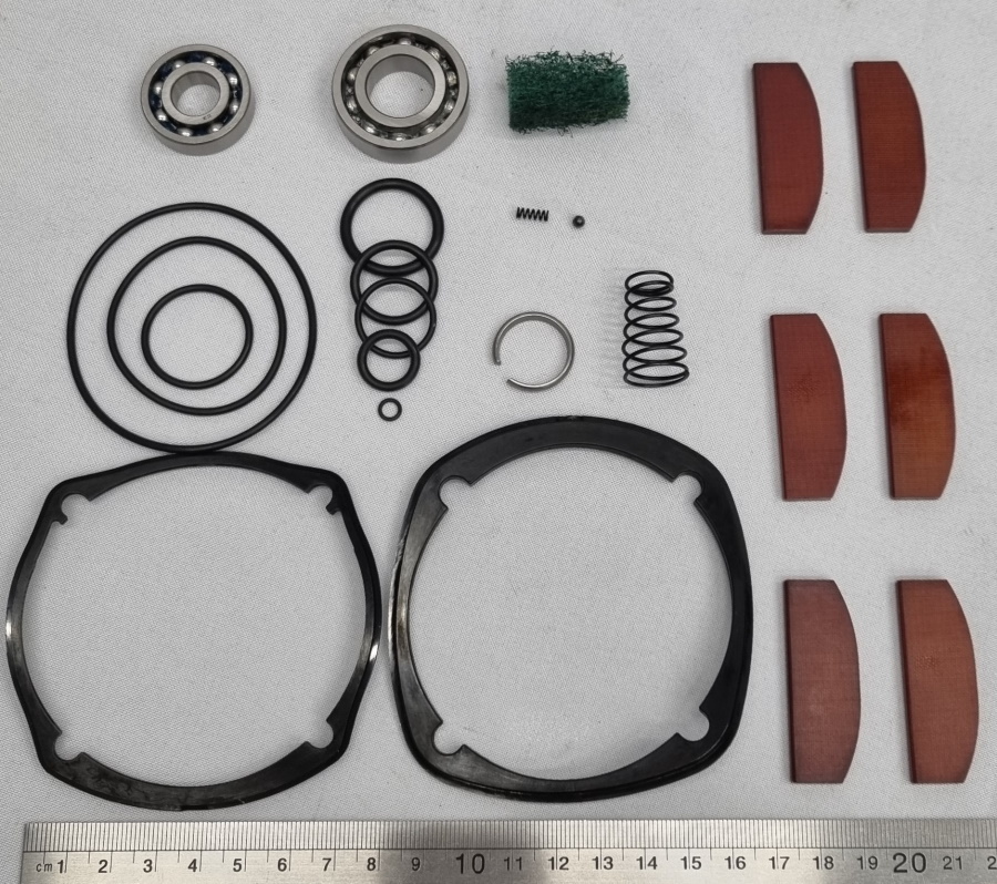 Ремонтный комплект для гайковерта. Расширенный комплект запчастей и расходных материалов, специально разработанный для проведения большого ТО, позволяет заменить практически все необходимые элементы выработавшие свой ресурс. Состав комплекта: 1. Задний подшипник ротора 2. Передний подшипник ротора 3. Пружина пускового клапана подачи воздуха. 4. Лопасть ротора. (комплект 6шт.) 5. Уплотнительные кольца крышек цилиндра 6. Наполнитель для пневматического глушителя 7. Прокладка корпуса ударного узла 8. Прокладка корпуса задней крышки 9. Уплотнительные кольца для узла реверса 10. Пружина +шарик крышки цилиндра ротора 11. Уплотнитель + стопорное кольцо посадочного квадрата Применяемость к пневматическому гайковерту 86117