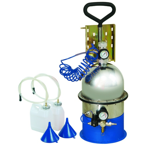- Принцип работы заключается в вытеснении старой тормозной жидкости через бачок для тормозной жидкости автомобиля новой жидкостью из верхнего резервуара установки. Верхняя камера резервуара заполняется тормозной жидкостью. В нижнюю камеру резервуара подается сжатый воздух, камеры разделены промежуточной мембранной камерой для более плавной подачи жидкости в систему и избежания образования вспенивания. Бачок с тормозной жидкостью автомобиля соединяется через переходник и соединительный шланг с верхней частью резервуара.